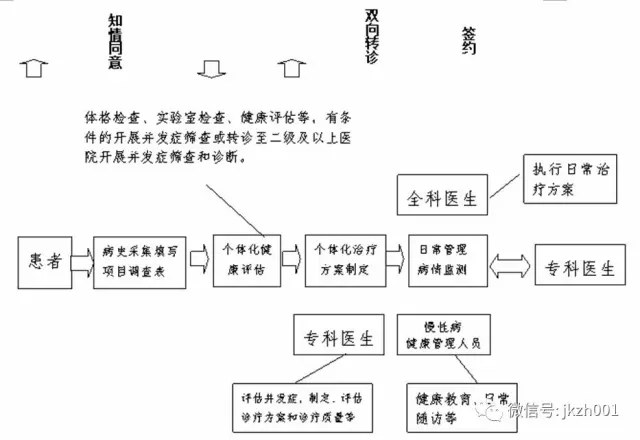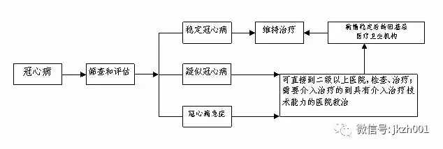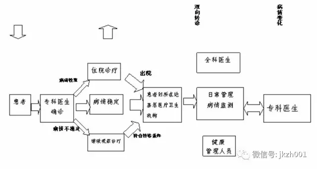 从这张分级诊疗流程图当中,我们大致可以总结出这么两个方面的信息: ①一个完整的分级诊疗需要这么几类人参与:全科医生、专科医生、健康管理人员(包括教育、随访等);②完成分级诊疗的流程,需要多次的信息收集和传递,包括在不同的人员、不同的医疗机构之间。 依据这个基础的流程图,国家卫计委又针对签署四类疾病制定了具体的路径: 冠心病