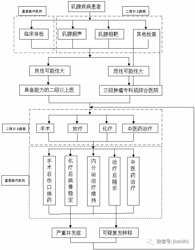 分级诊疗是当下医改的“主旋律”,而且已经开始从“说”落实到“做”。那么分级诊疗究竟应该怎么做?今年2月份以来,国家卫计委先后引发了有关冠状动脉粥样硬化性心脏病和脑血管疾病、慢阻肺、乳腺癌、甲状腺癌以及糖尿病视网膜病变的分级诊疗技术服务方案。 在这个四个方案中,除了各式各样的技术标准之外,还应该重视的是,方案中包含了两大类的分级诊疗服务流程图。而且看起来,这些图都是工作人员用word一点一点“手绘”出来的,值得好好看看。 冠心病和脑血管病、慢阻肺、乳腺癌和甲状腺癌这三个方案中都包含了同样一张基础流程图和各自的路径图,而糖尿病视网膜病变的则只有一张具体路径的流程图。接下来我们来一起看看这两张图的样子。 图一:心脑血管病、慢阻肺、乳腺癌和甲状腺癌服务流程 先来看下三类疾病的简要情况: 根据《中国心血管报告2014》数据显示,中国心血管病患病率处于持续上升阶段。目前,估计全国有心血管病患者2.9亿,其中卒中患者至少700万,心肌梗死患者250万。 根据国家卫生计生委2015年发布的《中国居民营养与慢性病状况报告》,我国40岁及以上人群慢阻肺的患病率约为9.9%。 《中国乳腺疾病调查报告》显示,2003年至2009年我国城市乳腺癌的死亡率增长了38.9%,其中有84%的乳腺癌患者不重视早期检查和治疗,延误了治疗时机。 2010年全国有甲状腺结节患者约2.5亿人,其中甲状腺癌患者约1250万左右。 但这三类疾病都有一个共同的特点,就是早发现、早诊断、早治疗对结果的影响非常大,以及病程都比较长,需要长期的疾病管理。比如早期乳腺癌患者的5年生存率可达90%,而晚期乳腺癌则不足40%;再比如像慢阻肺就需要长期治疗和管理。 由此,我们就可以看到,基层医疗机构在早期人群教育、患者疾病管理、及早预防发现方面承担着非常重要的作用。详细如下图: