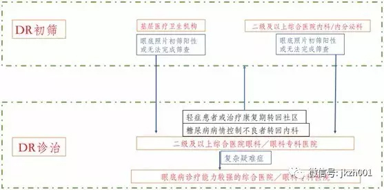 图二:糖尿病视网膜病变(DR)服务流程图 循证医学研究证明,高血糖、高血压、高血脂及糖尿病病程是糖尿病视网膜病变发生的重要危险因素。因此,严格控制血糖、血脂、血压等多种危险因素,同时进行眼底筛查,可显著降低糖尿病患者发生糖尿病视网膜病变的危险性;对早期糖尿病视网膜病变患者采取有效的干预措施,可显著降低糖尿病视网膜病变致盲率。 根据国际糖尿病联盟统计结果显示,截至2015年,我国糖尿病患者约1.1亿人,按此推算我国糖尿病视网膜病变患者约2700万人。 部分糖尿病视网膜病变的流行病学结果显示:50%以上糖尿病患者未被告知应定期眼底检查。近70%的糖尿病患者未接受规范的眼科治疗,约90%具有激光治疗指征的糖尿病视网膜病变未治疗。在应接受激光治疗的患者中仅有20%接受了规范的激光治疗。 对于糖尿病视网膜病变来讲,除了对三高的风险因素进行控制外,最关的环节就是有效的眼底筛查。但问题就在于我国87%的糖尿病患者就诊于县级及以下医疗机构。但是糖尿病视网膜病变的基本诊疗措施和适宜技术却在三级医疗机构实施。 由此看来,让基层医疗机构具备筛查意识、筛查能力,其实是糖尿病视网膜病变早发现、早治疗的关键。应该说前述的图一是整个分级诊疗服务流程的基础,但对糖尿病视网膜病变来讲,前期管理、后期随访上可能要求不是那么高,而筛查、诊治则是最核心的两个环节。具体如下图: