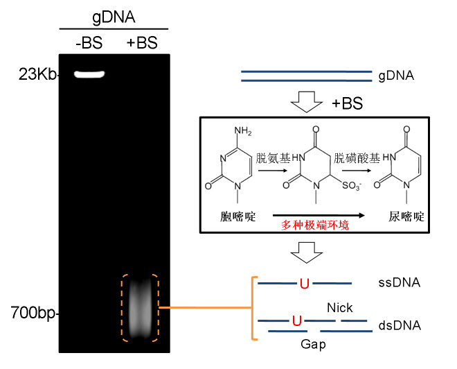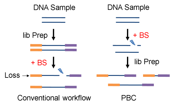 图2:亚硫酸氢盐处理导至DNA损伤示意图[3] 三、转化后建库策略/Post-Bisulfite Construction改善BS文库构建效率的一种办法是先进行BS转化再构建文库(Post-Bisulfite Construction, PBC),这种策略能够有效的规避BS处理对预文库的损伤,提高模板利用率,降低建库起始量,同时提高测序文库丰富度,增加有效测序数据 (5)。经Bisulfite处理后,DNA以单链和双链的混合状态存在,传统双链连接接头的建库方法不再适用。