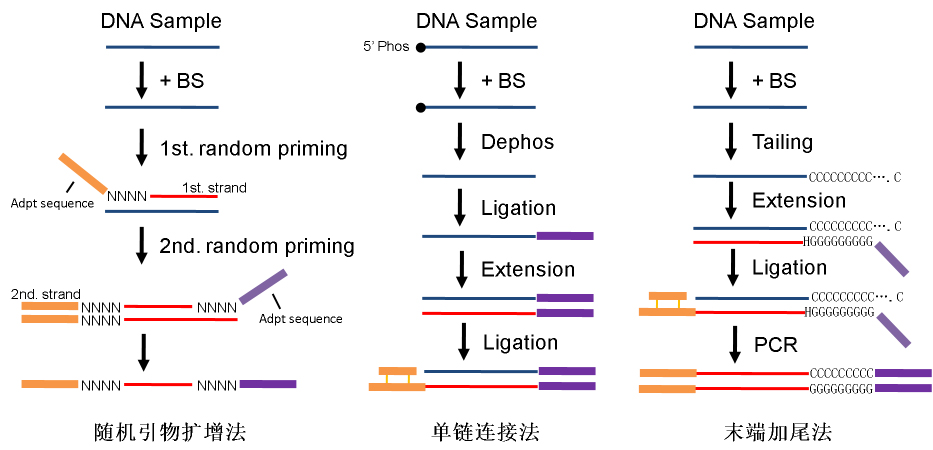 图3:转化后建库优势示意图 接下来,再来说说PBC建库方法: 1. 随机引物扩增法 与传统RNA-seq、WGA方法类似,此方法利用一段随机序列合成一链 (随机序列的5’端具有单分子标记序列、接头序列等),然后利用含另一侧接头序列的随机引物进行二链合成,再通过PCR引入完整的测序接头得到测序文库 [5]。此方法的优势是操作简单,建库周期短,与任何基于随机引物建库的方法一样,如何控制扩增偏好是建库的关键。 2. 单链连接法 开发此方法的初衷是对高度降解的DNA进行文库构建[6],如古DNA、FFPE样本等;所以,单链连接法也适用于PBC文库构建。先将DNA变性为单链,去磷酸化防止单链DNA串连,再与单链接头连接,利用与单链接头互补的引物进行二链合成,并连接另一侧接头,经PCR扩增引入完整的测序接头序列并同时完成文库富集;此方法建库效率高,覆盖均一性好,但操作较为繁琐,建库周期较长;该方法在2017年已经升级至2.0版本,上述不足得到了优化 [7]。 3. 末端加尾法 末端加尾法是指利用末端转移酶 (TDT) 向底物3’端添加同聚多核苷酸尾 (Tailing),再利用尾部序列作为二链合成引物的互补区进行二链合成 (Extension) 后,将另一侧接头连接至双链DNA (Ligation),通过PCR扩增富集,完成文库构建的方法 [8]。此方法成功与否的关键有三点:1) TDT酶的底物利用率,直接关系到建库效率和文库丰富度,最终影响有效数据量;2) TDT酶的加尾偏好性,该特性会影响测序数据的覆盖均一性;3) 底物加尾长度,一方面,加尾过长会降低二链合成引物与尾部序列的退火效率,影响建库效率;另一方面,过长的尾部Poly序列会进一步加剧BS文库的碱基不均匀性,降低测序质量;加尾长度可以通过调整反应缓冲液或混入双脱氧核苷酸进行控制 [8][9]。