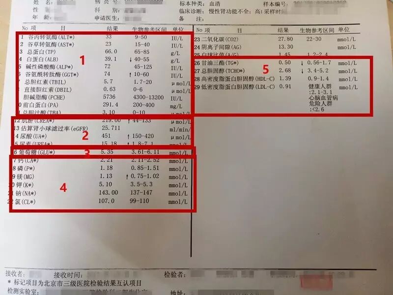 生化检查是临床最常用的一项化验。其中的项目主要包括:肝脏相关检查、肾功能、血糖、电解质、血脂等。 里面的项目很多,咱们肾友熟悉最主要和常见的,就可以了。下面我们根据一张完整的生化单,对照着来向大家做介绍。 1、肝脏相关检查 框1代表的是肝脏检查项目,其中临床医生最关注的是两个指标,谷丙转氨酶(ALT)和谷草转氨酶(AST)。 这两项异常,提示肝酶异常。例如,我们经常会跟肾友提到一些药物经过肝脏代谢,比如某些激素、雷公藤等,需要监测"肝功能",说的主要就是监测这两项。 另外,肝脏相关化验中,白蛋白和总蛋白也是我们肾内科经常会提及的,如果肾友尿中蛋白漏得比较多的时候,或者因为肝功能异常、营养不良等原因,血里面蛋白质就会减少,这两项值低,明显低于正常值时,患者就会表现为水肿。 2、肾功能 框2代表的是肾功能。只要是检验科的水平比较好,那么,抽血查的肾功能是目前最准确、最便宜、又最能反应肾功能问题的了。 看肾功能,咱们主要看肌酐(即血肌酐)的值。有的医院还会标注估算的肾小球滤过率,估算肾小球滤过率是根据肌酐、年纪、性别通过公式计算的,如果您的医院没有标注,您可以在掌上肾医患者端的医学公式中自己计算。根据算出来的值可以给慢性肾病患者进行分期,肾上线讲过多次,在此就不赘述了。如怎样区分肾病到哪个阶段了?;肾功能好不好,怎么看?一文彻底读懂肾功能检查 正常的肾功能,血肌酐男性在80umol/l上下,女性在60umol/l上下,但跟患者的饮食、肌肉含量有关,对于爱吃肉食、肌肉发达的人,血肌酐比普通人群这个值高一些。 肌酐明显升高,提示肾功能减退;肌酐太低了,跟营养不良有关。 3、葡萄糖 框3葡萄糖,即血糖,因为我们抽血一般是空腹抽,所以这里的葡萄糖是空腹的血糖值,只能反映空腹血糖正不正常。 现在糖尿病患者非常多,糖尿病会引起肾病,糖尿病肾病是导至透析的头号原因。已有肾病患者,再患上糖尿病,对肾脏可能造成严重威胁,因此,把血糖控制在目标范围对肾友而言是非常必要的。 4、电解质 一般肾功能正常和轻度异常的肾友,电解质也是正常的,所以大家对电解质关注的比较少。 但是对于严重肾功能不全的、尿毒症的肾友,电解质往往是紊乱的,电解质紊乱,比如常见的高钾,都是非常危急的情况,因此,肾功能明显异常者需要定期监测电解质,有异常要及时处理。 5、血脂 看血脂,框中四个项目都需要看。详细可点击阅读☞血脂检查怎么看? 血脂高一点的,可能医生会让你控制饮食,积极锻炼来降低血脂。高得比较明显,一般医生会使用降脂药。 因为肾病患者是心血管病的高危人群,而控制血脂对心血管的益是非常大的,因此,定期检查血脂,控制在正常范围对肾友是非常必要的。  |
