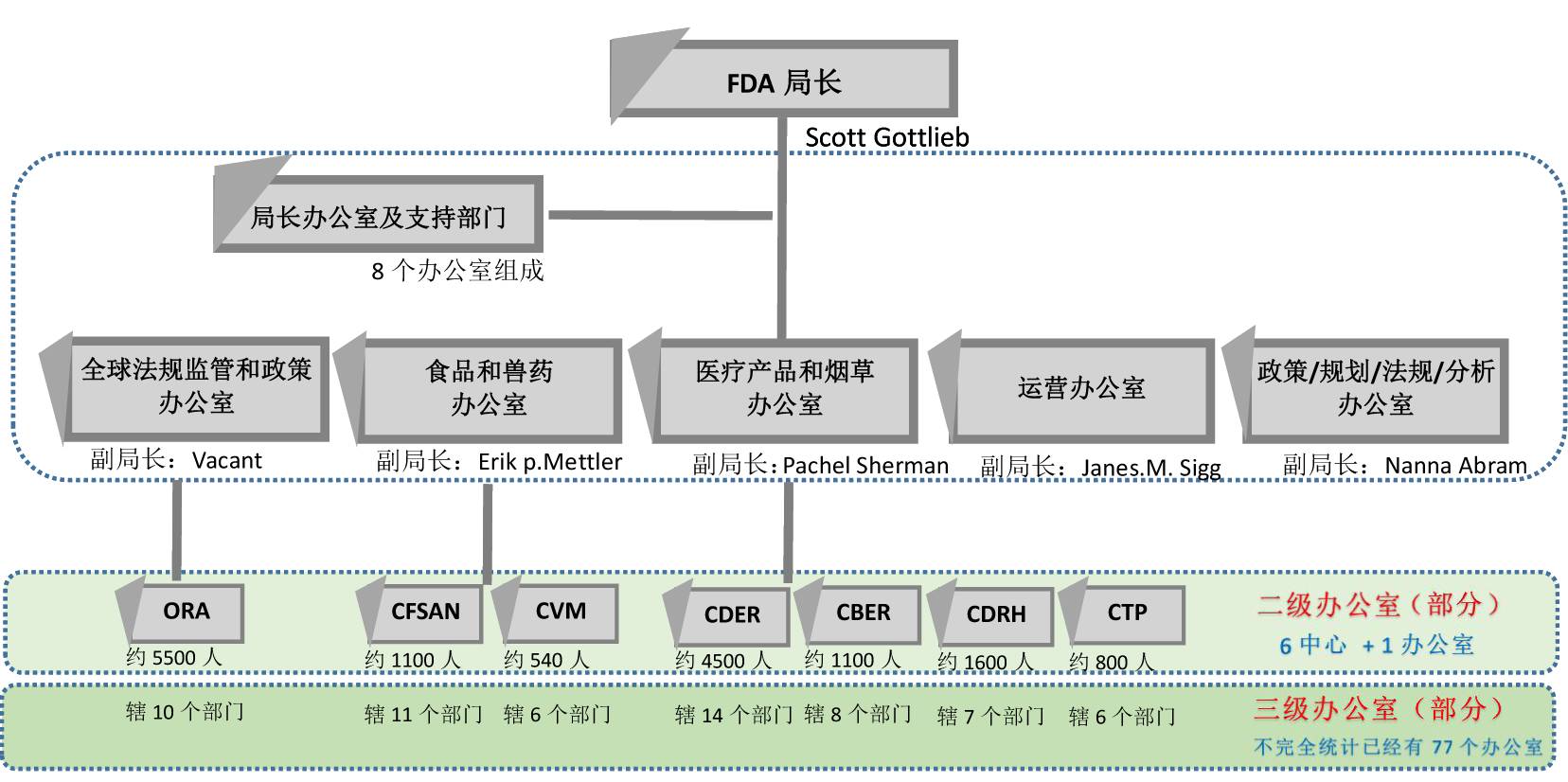 1. 局长办公室及支持部门:可以将FDA局长视为直接领导人,下辖8个办公室 2. 个政策/规划/法规和分析办公室(类似于国内的政策法规部门):由一个副局长直接领导,下辖4个办公室 3. 个运营办公室:由一个副局长直接领导,下辖6个办公室 3个具有产品监管职能的办公部门,分别是: 4. 医疗产品和烟草办公室:由一个副局长直接领导,下辖6个办公室 5. 食品和兽药办公室:由一个副局长直接领导,下辖4个办公室 6. 全球法规监管和政策办公室:由一个副局长直接领导,下辖2个办公室