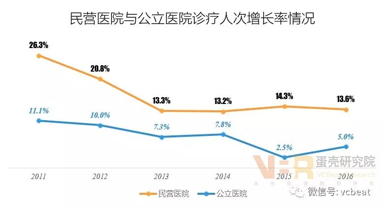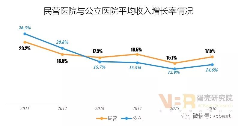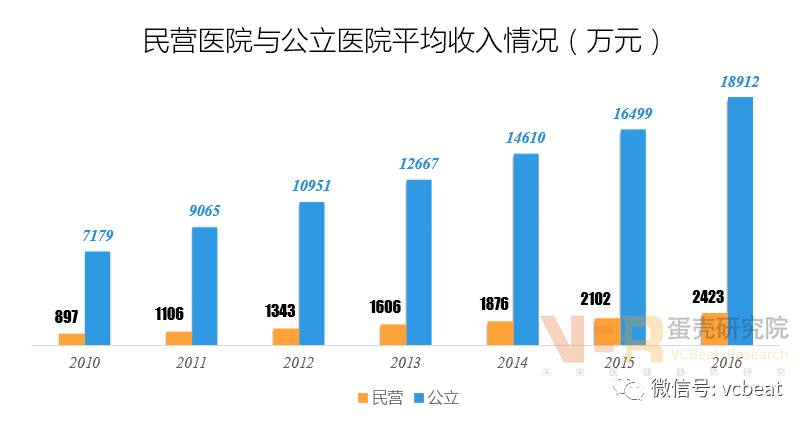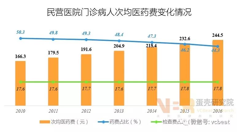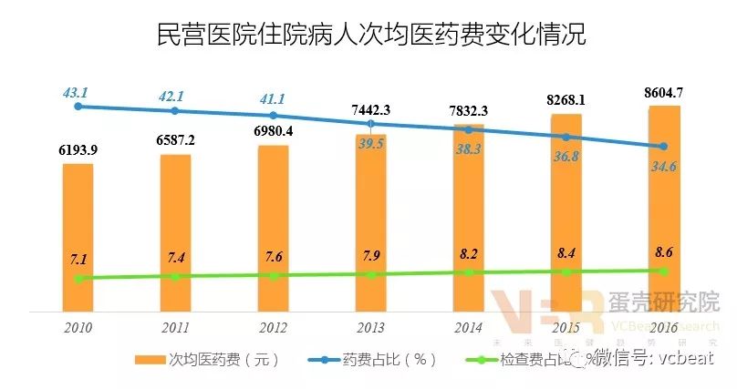 收入水平逐步提高,经营风险值得关注 9、财务状况:资产负债率偏高,偿债能力较弱 数据来源:中国卫生和计划生育统计年鉴(2017年),蛋壳研究院整理 与公立医院比较,民营医院的资产负债率偏高,导至偿债能力偏弱。 这主要是因为在财政经费支持方面,民营医院远不如公立医院,需要通过大规模向银行贷款及社会举债来实现融资需求,导至民营医院债务高企,后期需要加强财政支持和优化融资结构来控制债务风险。 10、诊疗人次:总量增加,增速较快 数据来源:中国卫生和计划生育统计年鉴(2017年),蛋壳研究院整理 数据来源:中国卫生和计划生育统计年鉴(2017年),蛋壳研究院整理 在诊疗人次方面,与公立医院相比,存在较大差距,但是增长速度高于公立医院。 由于公立医院床位数、医务人员以及设备方面占据绝对优势,医疗服务整体实力强大,能够接纳更多的患者,所以,诊疗人次远远高于民营医院。 但是,随着民营医院的发展,数量超过公立医院,覆盖范围更广,同时在医务人才、设施设备方面的不断改善,诊疗人次的增长较快,在增速上明显高于公立医院。 11、收入状况:收入水平提高,发展能力增强 数据来源:中国卫生和计划生育统计年鉴(2017年),蛋壳研究院整理 民营医院与公立医院在平均收入方面虽然存在差距。 医院收入与诊疗人次成正比,公立医院的诊疗人次平均是私立医院的8.7倍,导至二者之间形成巨大收入差距。 但是从2013年后,民营医院平均收入的增速高于公立医院,主要是民营医院诊疗人次增速较快且高于公立医院,提高了收入增长速度。 12、医药收入:收入逐步增加,药费占主导 数据来源:中国卫生和计划生育统计年鉴(2017年),蛋壳研究院整理 病人次均医药费逐年递增:表明家庭医疗消费支出不断扩大,就诊患者数量也在增加。 药费占比逐年减少,检查费占比逐年增加:这主要得益于居民医疗消费需求增长,愿意投入更多资金到检查项目,维护身体健康。 检查费占比低于药费占比:表明医院收入主要来自于药品,成为导至药价居高不下的主要原因,未来应该加强药品占比控制。 总体上,近几年我国民营医院取得了较快的发展,收入水平不断提高,服务能力逐步增强。但是,与公立医院相比,基础设施和服务水平方面还存在较大差距,制约民营医院发展的关键是人才和医疗质量。 未来,民营医院需要整合资源,进行模式创新,加强与医学院校合作突破瓶颈,实现健康持续发展。 今年5月,动脉网蛋壳研究院发布《2017社区连锁诊所白皮书》,该报告对国内社区连锁诊所进行了全景扫描,希望复盘整个产业链,从社区连锁诊所的发展路径着手进行分析讨论,为基层相关产业人士提供一点新思路。