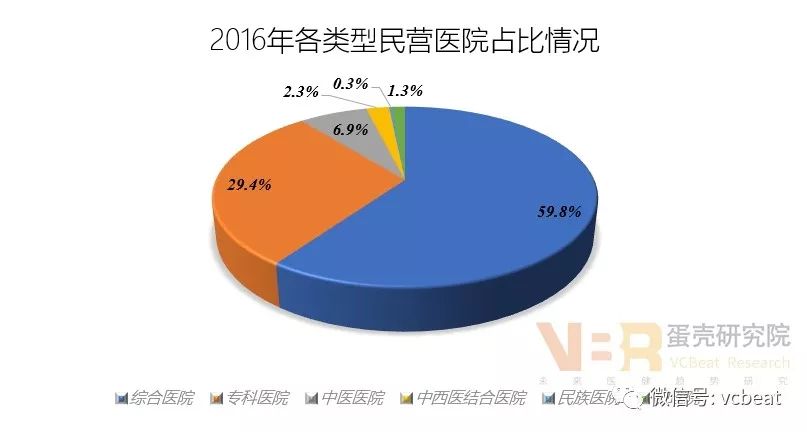 民营医院数量逐年增加,公立医院数量逐年减少。2015年,民营医院数量超过公立医院。这表明,在政策门槛逐步放低的情况,社会资本积极参与民营医院建设。 2、医院类型:综合性医院为主,专科医院为辅 数据来源:中国卫生和计划生育统计年鉴(2017年),蛋壳研究院整理