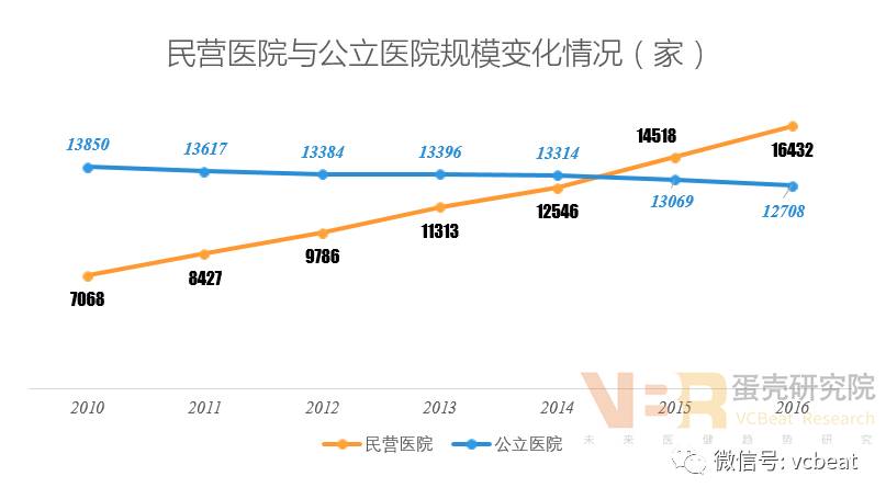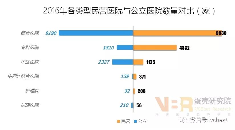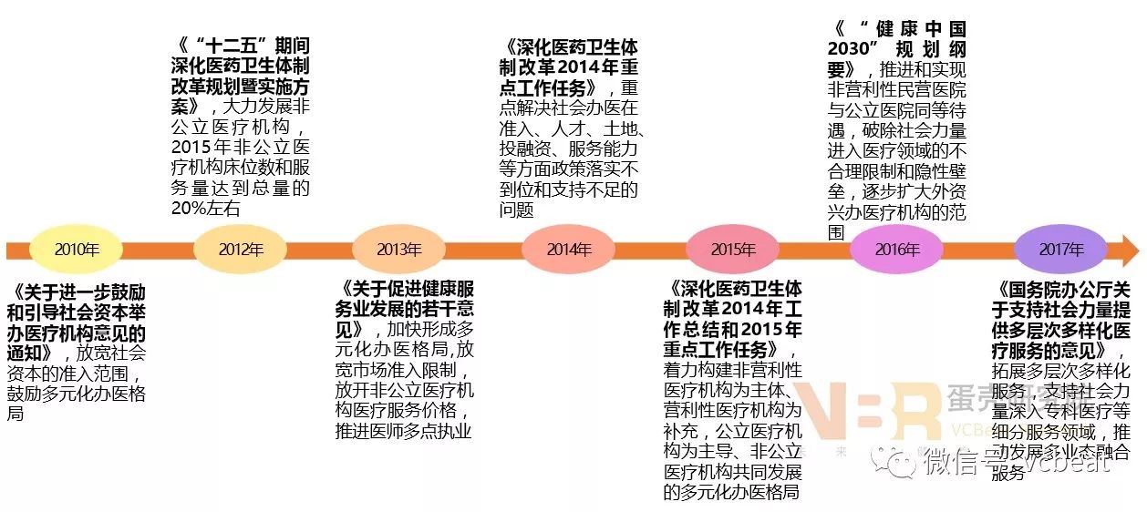 近年,社会办医成为我国医疗卫生事业改革的亮点和关键点,而民营医院的发展则是社会办医落地的重要举措。 我国要实现“共享共建,全民健康”的健康中国战略目标,必须加快推进民营医院的发展,制定配套政策,鼓励社会资本积极参与民营医院建设,改变发展滞后的现状。但是,由于民营医院建设起步晚、底子薄,发展过程中呈现多而不强的特点。 政策支持:逐年细化,可操作性更强 2010-2017年民营医院主要政策 政府关于社会办医的支持政策从规划层面到具体指导层面,操作性越来越强,推动了我国民营医院建设由缓慢推进阶段迈入高速发展阶段。 特别是2016年《“健康中国2030”规划纲要》的颁布,打破了民营医院与公立医院区别对待局面,破除了社会资本办医的壁垒,加速了民营资本和外资投资民营医院建设的步伐,民营医院达到16432家,超出公立医院3724家。 民营医院进入快速发展期,呈现多而不强的特点 1、医院数量:数量逐年增加,超过公立医院 数据来源:中国卫生和计划生育统计年鉴(2017年),动脉网整理