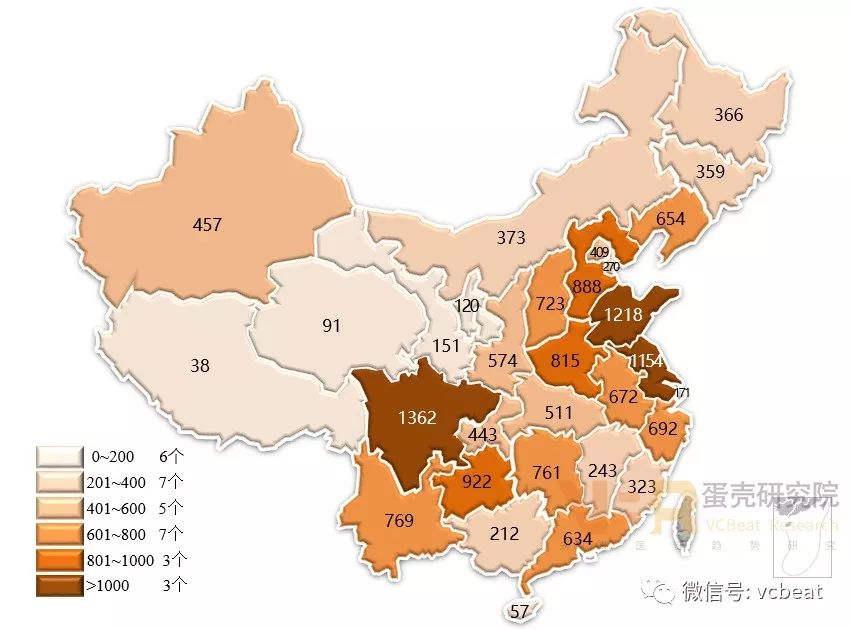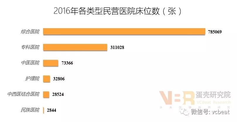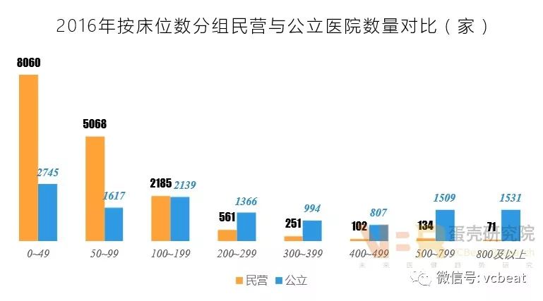 数据来源:《医院分级管理办法》 一级民营医院数量最多且多于同级公立医院数量;二级、三级民营医院数量偏少,与公立医院存在较大差距。 民营医院中,三级医院占比仅为2%。这表明民营医院在床位数、科室设置以及人员配备方面不及公立医院,民营医院发展壮大需要大幅提升综合服务能力。 5、地域分布:四川最多,西藏最少 2016年各省(市)民营医院数量情况 数据来源:中国卫生和计划生育统计年鉴(2017年),蛋壳研究院整理 仅3省数量破千:四川、山东、江苏民营医院数量都在1000以上,这些省份人口数量较多,需求量大。 沿海省份数量优势明显:沿海地区经济发展水平高,为民营医院建设营造了良好的经济环境。 西北省份数量偏低:西北地区人口偏少且经济发展滞后,制约了民营医院发展。 服务能力不断增强,人才成为发展瓶颈 6、医务人员:医师资源稀缺,人才瓶颈凸显 数据来源:中国卫生和计划生育统计年鉴(2017年),蛋壳研究院整理 民营医院的卫生服务人员与公立医院存在很大差距,特别是执业医师和注册护士人员匮乏,医务人才成为发展阻碍因素。 7、床位情况:数量逐年递增,规模总体偏小 数据来源:中国卫生和计划生育统计年鉴(2017年),蛋壳研究院整理 数据来源:中国卫生和计划生育统计年鉴(2017年),蛋壳研究院整理 总量递增,增速较高:民营医院床位数不断增长,近几年增速都在20%左右,表明民营医院的数量增加且规模也在扩大。 床位数越多,差距越大:大部分民营医院的床位数在200张以下,而且床位数越多,公立医院的数量优势越明显,表明总体上民营医院接纳能力偏弱。 8、床位情况:综合医院最多,专科医院次之 数据来源:中国卫生和计划生育统计年鉴(2017年),蛋壳研究院整理 综合性民营医院的床位数最多,且在数量上远远超过其他类型医院,主要是因为综合性医院就诊患者最多,床位需求量大。