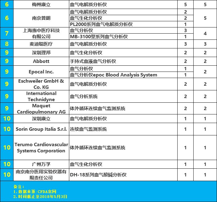 导读:中国血气市场是全世界最具有活力的市场之一,全球6%的平均增长率,而中国的增长接近20%。那么,在这个市场上,都有哪些玩家在拼杀竞争?麦科田医疗根据CFDA公开数据,整理了《血气分析仪注册证数量排行榜》,方便大家一览这个行业的主要玩家,供各位参考。 具体榜单如下: 1. 注册证拥有数前三甲分别为:雷度米特(16个)、西门子医疗(13个)、罗氏诊断(9个)。 2. 沃芬收购美国Instrumentation Laboratory后,仍以IL为注册人主体。 3. 从注册产品名称我们可以发现,随着技术的发展,血气、生化和电解质测定正逐步走向融合,越来越多的高端玩家在推出三者一体的分析仪产品。 4. 国产血气领域的代表企业,梅州康立和南京普朗是注册证数量最多的企业,其次是上海润达qixia的上海惠中。从市场反应来看,国产血气品牌在中国市场的占有率远低于国际品牌,实在令人惋惜! 5. 借着各种专科ICU的建设风潮,相信未来血气市场一定会朝着多元化、信息化的方向继续前行,会不会有更多优秀的国产企业异军突起,实现弯道超车?让我们拭目以待! |