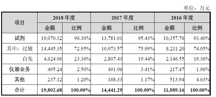 浩欧博采用以经销为主,直销为辅的销售模式,通过 “仪器试剂配套相结合”的商业模式带动试剂销售并获取利润。截至2018年12月31日,已累计对外投放仪器1259台。2016年度、2017年度和2018年度公司经销金额占主营业务收入的比例分别为96.36%、94.72%和86.72%,从数据来看,经销收入占比在持续下降。