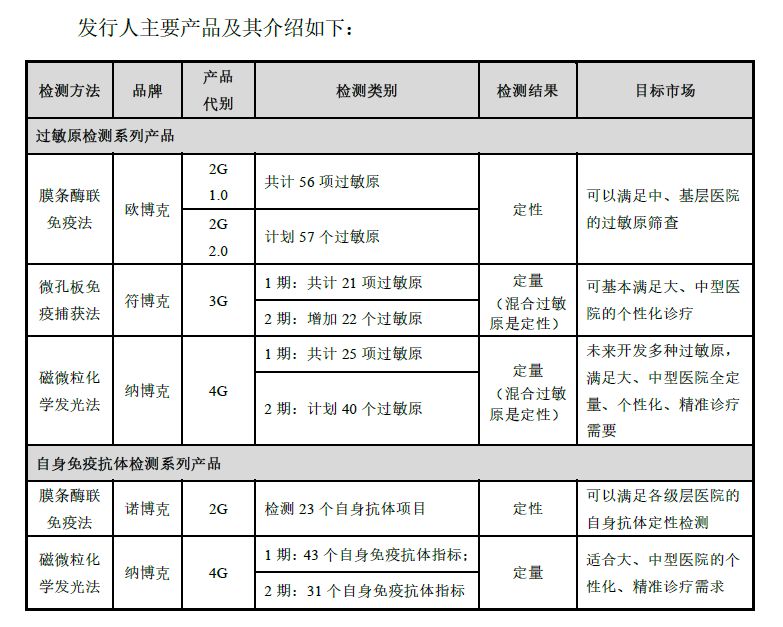 招股说明书(申报稿)显示,发行人本次发行不低于 1576.4582万股,占发行后比例不低于25%。拟募集资金6.19亿元,用于体外诊断试剂生产及研发的新建体外诊断试剂生产及研发的新建项目 、营销及服务网络平台扩建项目 ,具体包括新建年产 90 万盒过敏性疾病体外诊断试剂项目、新建年产 120 万盒自身免疫性疾病体外诊断试剂项目 、新建体外诊断试剂研发中心项目和营销及服务网络平台扩建。项目建成达产后,发行人产能增幅较大。