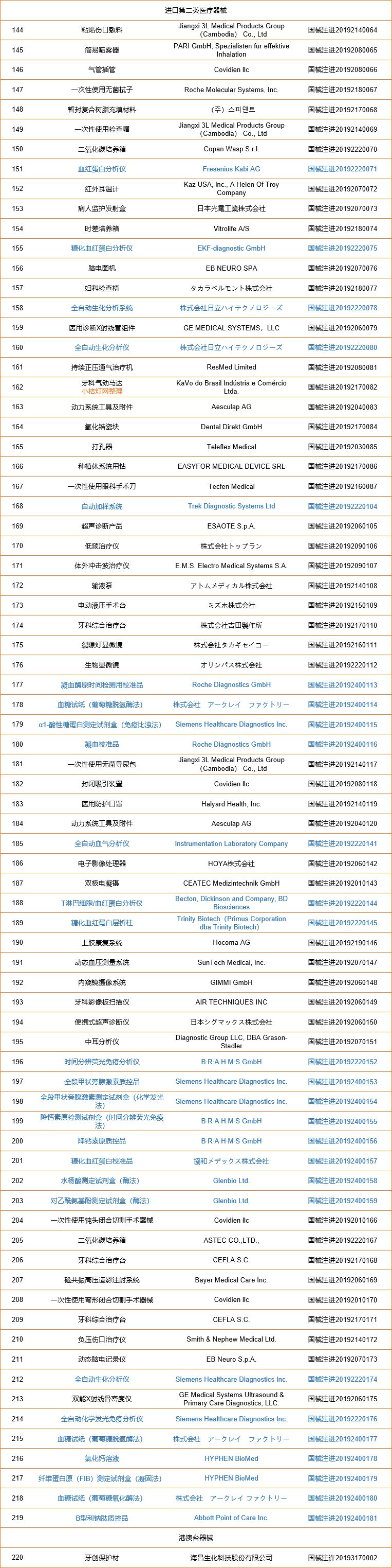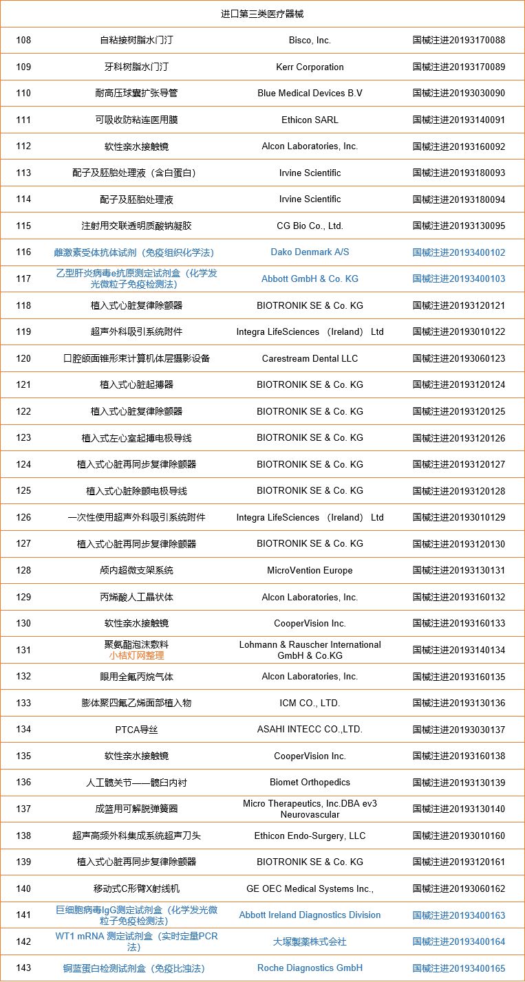 2019年3月,国家药品监督管理局共批准注册医疗器械产品220个。其中,境内第三类医疗器械产品107个,进口第三类医疗器械产品36个,进口第二类医疗器械产品76个,港澳台医疗器械产品1个(具体产品见下表,包含63项体外诊断产品)。 |