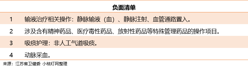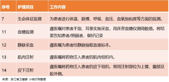 从各地公布的护理项目来看,其服务项目涉及的范围大致相同,生命体征监测、血糖检测、标本采集、皮下注射和肌肉注射等均在列。另外,江苏还明确了“负面清单”,禁止涉及含有精神药品、医疗毒性药品、放射性药品等特殊管理药品和有创操作技术项目等。