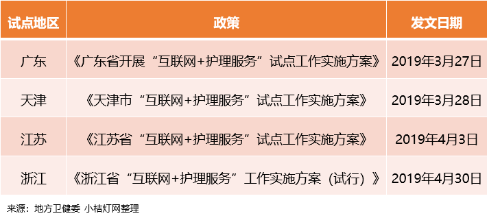 今年初,国家卫健委发布关于“互联网+护理服务”试点工作的通知。印发了试点工作方案,确定北京市、天津市、上海市、江苏省、浙江省、广东省作为试点省份。并要求试点省份于2019年2月25日前报送实施方案,于2019年12月底前报送试点工作总结。方案提出,“互联网+护理服务”重点对高龄或失能老年人、康复期患者和终末期患者等行动不便的人群,提供慢病管理、康复护理、专项护理、健康教育、安宁疗护等方面的护理服务。国家卫健委要求试点地区结合实际,在调查研究群众服务需求,充分评估环境因素和执业风险的基础上,组织制订本地区“互联网+护理服务”项目。原则上,服务项目以需求量大、医疗风险低、易操作实施的技术为宜。