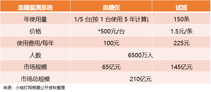 随着患者监测意识逐步增强,以平均每周监测3次计算,每个患者年均使用150条血糖试纸。渗透率进一步提升至国际平均水平,血糖仪的需求将达到 6500 万台左右,市场空间将超过200亿元。
