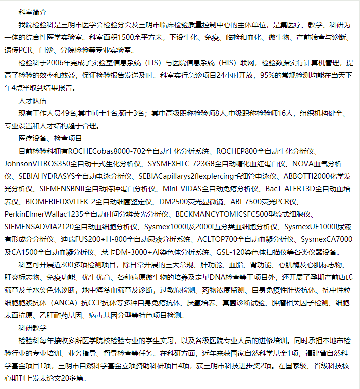 摘要: 我院检验科是三明市医学会检验分会及三明市临床检验质量控制中心的主体单位,是集医疗、教学、科研为一体的综合性医学实验室。