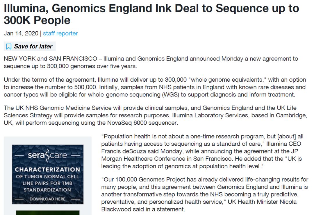 近日,Illumina和Genomics England签署了一份新协议,目标在五年内完成30万个基因组测序。