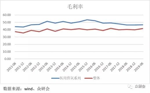医用供氧业务的毛利率近几年呈下降趋势,2019上半年为46.56%,高于公司整体毛利率。