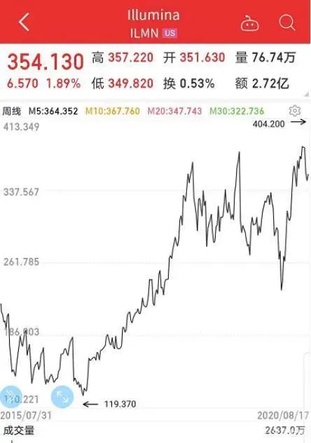 不断攀升的业绩也支撑着Illumina公司股价暴涨,截止目前,该公司每股价格为354美元,总市值超过520亿美元。