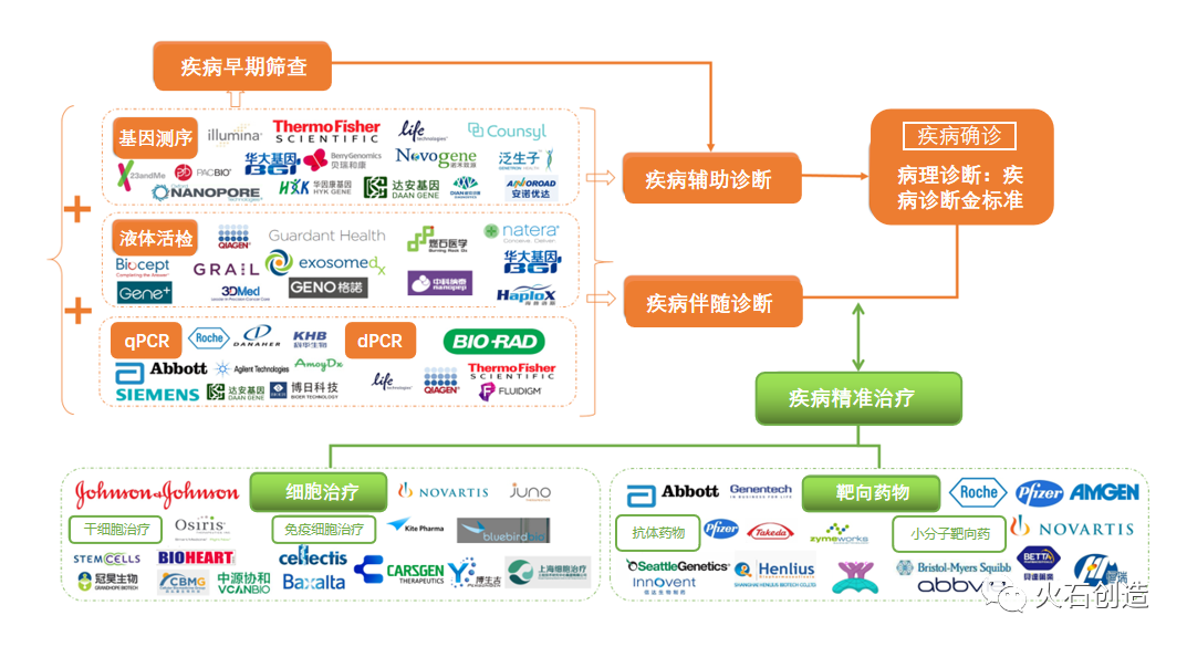 精准医疗包括对风险的精确预测、疾病精确诊断、疾病精确分类、药物精确应用、疗效精确评估,与疗后精确预测。精准医疗是科学技术及医学自身发展的客观必然,也是广大民众摆脱了贫困以后对健康、教育、生活质量追求的必然。 精准医疗主要包括精准诊断和精准治疗,其中以分子诊断为主的体外诊断技术是精准医疗的重要组成部分,其在靶向抗癌药物使用上是必不可少的环节。针对乳腺癌的HER-2基因过表达、HER-2基因拷贝数变异;肺癌的EGFR敏感性突变;非小细胞肺癌、黑色素瘤、甲状腺癌中的ALK、ROS1、BRAF基因突变;胃肠道间质瘤的C-KIT基因检测等均证明了分子诊断在癌症治疗过程中的必要性和重要性。