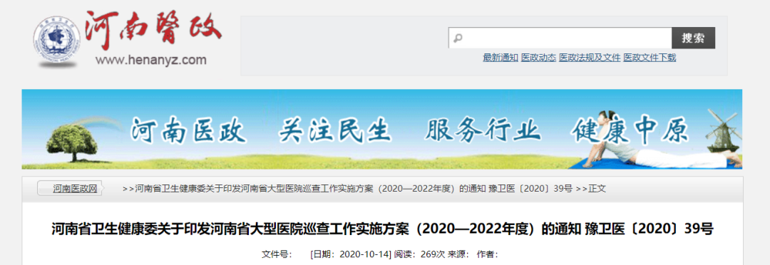 10月14日,河南省卫健委发布《河南省卫生健康委关于印发河南省大型医院巡查工作实施方案(2020—2022年度)的通知 豫卫医〔2020〕39号》(下称《通知》)。