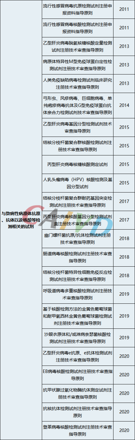 自2011年起,国家药品监督管理局医疗器械技术审评中心已发布88个体外诊断检测试剂和43个临床检验器械注册技术审查指导原则。注册技术审查指导原则旨在指导注册申请人对医疗器械注册申报的准备工作,同时也为技术审评部门审评提供参考,这既加强了医疗器械注册工作的监督和指导,又进一步提高了注册审查质量。对于体外诊断行业而言,这是产品上市之路的“必修书”。相关指导原则整理如下: |