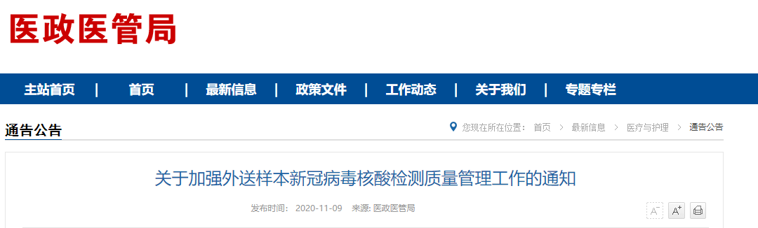 请各地收到本通知后,立即组织对辖区内接收外送样本进行核酸检测的实验室进行摸排,查找薄弱环节并进行整改。相关工作情况请于11月15日前书面报我组,电子版通过委省交换平台发送至“国家卫生健康委医政医管局医疗管理处”。
