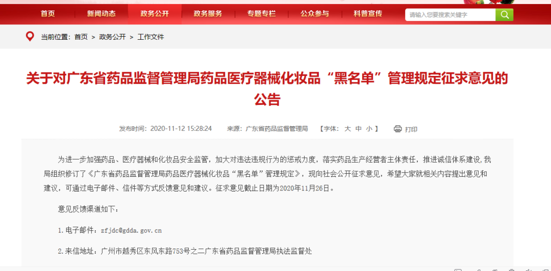 | 近日,广东省药监局发布《关于对广东省药品监督管理局药品医疗器械化妆品“黑名单”管理规定征求意见的公告》,进一步加强药品、医疗器械和化妆品安全监管。为进一步加强药品、医疗器械和化妆品安全监管,加大对违法违规行为的惩戒力度,落实药品生产经营者主体责任,推进诚信体系建设,我局组织修订了《广东省药品监督管理局药品医疗器械化妆品“黑名单”管理规定》,现向社会公开征求意见,希望大家就相关内容提出意见和建议,可通过电子邮件、信件等方式反馈意见和建议。征求意见截止日期为2020年11月26日。第一条 为进一步加强药品、医疗器械和化妆品(以下简称“两品一械”)安全监管,加大对违法违规行为的惩戒力度,落实药品生产经营者主体责任,推进诚信体系建设,根据《中华人民共和国药品管理法》、《中华人民共和国政府信息公开条例》、《医疗器械监督管理条例》、《化妆品监督管理条例》、《广东省化妆品安全条例》等有关法律法规,制定本规定。第二条 本规定所称“两品一械”生产经营者,是指在本省辖区内,从事“两品一械”的生产经营(含使用,下同)的公民、法人或者其他社会经济组织。第三条 省药品监督管理局负责全省“两品一械”“黑名单”的管理工作。市、县负责药品监督管理的部门(以下简称“药品监管部门”)负责本行政区域内“两品一械”“黑名单”信息的管理工作。县级以上药品监管部门应当按照本规定的要求,将性质恶劣、情节严重、社会危害程度较大的严重违法失信行为行政处罚信息纳入“黑名单”,通过政务网站等方式向社会公布。第四条 符合下列情形之一的“两品一械”生产经营者纳入“黑名单”:(一)违反法律法规,情节严重,被药品监管部门作出吊销许可证或撤销批准证明文件行政处罚的;(二)在案件查办过程中,因伪造或者故意破坏现场,转移、隐匿、伪造、销毁有关证据资料,拒绝、逃避监督检查,拒绝提供有关情况和资料,或者擅自动用查封扣押物品,受到行政处罚且性质恶劣的;(三)隐瞒有关情况、提供虚假证明或者采取其他欺骗、贿赂等不正当手段,取得相关行政许可、批准证明文件或者其他资格,且性质恶劣的;(四)因受到行政处罚,相关责任人员在法定期限内不得从事疫苗生产经营活动的;(五)由药品监管部门移送公安机关或联合公安机关查处的,受到有期徒刑以上刑事处罚的制假窝点相关责任人员;(六)法律、法规、规章明确规定构成情节严重、性质恶劣、社会危害程度较大的。第五条 各级药品监管部门应当按照“谁处罚、谁公布”的原则,在作出行政处罚决定或收到刑事判决书后7个工作日内,将应当纳入“黑名单”的相关信息在其政务网站上公布。(一)违法生产经营者的名称、统一社会信用代码、违法事实、处罚(判决)依据、处罚(判决)结果、公布期限等;(二)法定代表人、主要负责人、直接负责的主管人员和其他责任人员的姓名、身份证号码(隐去部分号码),违法事实、处罚(判决)依据、处罚(判决)结果、公布期限等;第七条 “黑名单”公布的期限,应当与其被依法采取行为限制措施的期限一致。法律、行政法规未规定行为限制措施期限的,公布期限为3年,公布期限自公布之日起计算。第八条 当事人对已生效的行政处罚决定提起行政复议或行政诉讼的,不影响药品监管部门将其纳入“黑名单”。第九条 被纳入“黑名单”的当事人提起行政复议或者行政诉讼,原行政处罚决定被变更或撤销的,做出公布“黑名单”的药品监管部门应当在收到或知道行政复议决定书、行政诉讼判决书之日起7个工作日内视变更或撤销内容对公布的“黑名单”进行变更、撤销或维持等相应处理。第十条 各级药品监管部门应将公布的“黑名单”信息于5个工作日内逐级上报省药品监督管理局,省药品监督管理局在其政务网站上予以转载。第十一条 纳入“黑名单”信息的期限届满时,由公布信息的部门将“黑名单”专栏中的信息转入数据库。省药品监督管理局建立全省“黑名单”数据库,县级以上药品监督管理部门应当建立本级“黑名单”数据库,实现信息共享。第十二条 各级药品监管部门应根据本规定制定“黑名单”管理制度,指定专门机构、安排专职人员负责“黑名单”信息的汇总、审核和发布工作。第十三条 各级药品监管部门将纳入“黑名单”的“两品一械”生产经营者记入监管信用档案,实施重点监管。第十四条 各级药品监管部门要建立健全“黑名单”的生产经营者信息与行政许可系统对接联动机制。对“黑名单”中申请“两品一械”行政许可或聘用到法律禁止岗位的生产经营者,各级药品监管部门应依法不予受理。第十五条 各级药品监管部门依托全国信用信息共享平台共享“黑名单”信息,对纳入“黑名单”的药品生产经营者实行跨部门联合惩戒。第十六条 鼓励社会组织或者公民对纳入“两品一械”“黑名单”的生产经营者进行监督,发现有违法行为的,可以向药品监管部门举报。第十八条 本规定自202 年 月 日起施行,有效期5年。原《广东省食品药品监督管理局食品药品安全“黑名单”管理规定》(粤食药监规〔2017〕6号)即行废止。 黑名单制度的出现也代表着国家将持续加大打击医疗行业违规的力度。正因如此,相信我国医疗行业的发展也将越来越好。