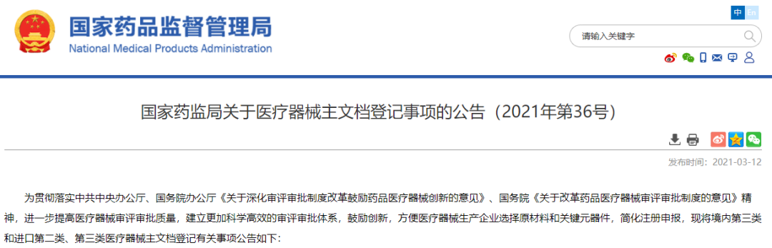 为贯彻落实中共中央办公厅、国务院办公厅《关于深化审评审批制度改革鼓励药品医疗器械创新的意见》、国务院《关于改革药品医疗器械审评审批制度的意见》精神,进一步提高医疗器械审评审批质量,建立更加科学高效的审评审批体系,鼓励创新,方便医疗器械生产企业选择原材料和关键元器件,简化注册申报,现将境内第三类和进口第二类、第三类医疗器械主文档登记有关事项公告如下: 一、医疗器械主文档内容主要涉及医疗器械原材料等。医疗器械注册申请人应当指导并协助主文档所有者按照医疗器械注册申报资料相关要求建立主文档。医疗器械注册申请人对其申报的医疗器械负全部责任。 二、医疗器械注册申请人在中华人民共和国境内提出的进口第二类、第三类及境内第三类医疗器械(含体外诊断试剂)注册、变更、临床试验审批等申请事项中所引用主文档的登记,适用于本公告。 三、国家药品监督管理局医疗器械技术审评中心(以下简称器审中心)建立医疗器械主文档登记平台(以下简称为登记平台)与数据库。主文档所有者可通过登记平台按本公告要求提交主文档登记资料,登记后获得主文档登记编号。器审中心待关联医疗器械提出注册相关申请后对主文档资料一并审评。 四、医疗器械主文档的登记为自愿行为。境内主文档所有者可自行申请登记。进口(含港澳台地区)主文档所有者应当委托境内代理机构申请登记。主文档登记资料均需经过主文档所有者签章,包括医疗器械主文档登记(更新)申请表及其随附登记资料和技术资料。外文文件还需提供简体中文翻译件(中文翻译件可由境内代理机构签章)。 五、主文档登记资料及签章等内容适用于医疗器械注册电子申报相关要求。主文档所有者或其代理机构申领eRPS系统配套使用的数字认证证书(Certificate Authority,CA)后,在电子申报系统中提交医疗器械主文档登记申请表(附件1)或医疗器械主文档登记更新申请表(附件2)、申请表随附登记资料、技术资料等登记资料。资料提交成功后,器审中心向主文档所有者或其代理机构发送医疗器械主文档登记回执(附件3)。登记回执仅证明主文档存档待查,供医疗器械产品注册等申报事项引用。国家药监局器审中心将适时在其官方网站公开主文档登记相关信息(附件4),以便于公众查询。 六、申请登记的医疗器械主文档登记资料形式要求见(附件5)。 七、已登记的医疗器械主文档内容发生变化时,主文档所有者可申请登记资料的更新。医疗器械主文档登记更新申请表见(附件2)。 八、医疗器械主文档登记具体要求详见《医疗器械主文档登记相关事项说明》(附件6)。 各省、自治区、直辖市药品监督管理局可根据实际情况参照本公告开展境内第二类医疗器械主文档登记事项 医疗器械主文档登记相关事项说明 医疗器械主文档是技术资料的一种形式。该类资料由其所有者提交给医疗器械技术审评机构,用于授权医疗器械注册申请人在申报医疗器械注册等事项时引用其作为注册申报资料的一部分。医疗器械技术审评机构不会向医疗器械注册申请人披露主文档资料内容。本说明旨在指导主文档所有者进行医疗器械主文档的登记及对医疗器械注册申请人的授权引用。 主要 法规依据 适用 范围 本说明适用于医疗器械注册申请人在进口二类、三类及境内三类医疗器械(包括体外诊断试剂)注册、变更、临床试验审批等申请事项中引用的主文档。 基本 原则 在医疗器械审评审批的过程中,医疗器械注册申请人有可能需要将第三方企业(如:原材料供应商)的技术保密资料提交给技术审评机构以支持相关注册申请。部分第三方企业可以接受监管机构对其技术资料进行保密审阅,却不希望将其技术资料直接披露给医疗器械注册申请人。主文档设立的目的是为了保护主文档所有者的商业秘密,此外也避免不同医疗器械注册申请人重复提交相同技术资料。主文档由其所有者自愿提交登记申请,监管机构对主文档进行登记。 如果主文档所有者为境外企业,需在中国境内设立代理机构,以便于及时就主文档登记工作与监管机构进行沟通,对主文档资料内容进行更新以及对医疗器械注册申请人进行授权引用。主文档所有者登记主文档时需明确代理机构的名称、地址、联系方式以及委托权限。通过主文档更新可以更改代理机构信息。 主文档 内容 主文档的内容可以涉及医疗器械多个方面,包括原材料等。医疗器械主文档需要包括具体技术内容,如原材料主文档可以包括原材料组成成分描述、物理性能研究资料、化学性能研究资料、生物学评价资料/毒理学风险分析资料等。但是对于一些明确要求在医疗器械申报资料中提交的内容,并不适合采用主文档的形式提交,如体外诊断试剂原材料信息等。 主文档的形式要求详见本公告(附件5)《医疗器械主文档登记资料形式要求》,以电子文档形式提交。如果所提交的主文档资料内容不符合主文档登记的要求,则无法作为主文档进行登记。 主文档的技术内容建议参照医疗器械/体外诊断试剂注册申报资料要求以及相关指导原则的适用要求提供。 主文档更新 相关要求 主文档所有者可以通过医疗器械监管机构对主文档进行更新,包括授权情况的变化、代理机构的变化以及主文档资料的任何变化。更新相关资料需提交更新后的全套