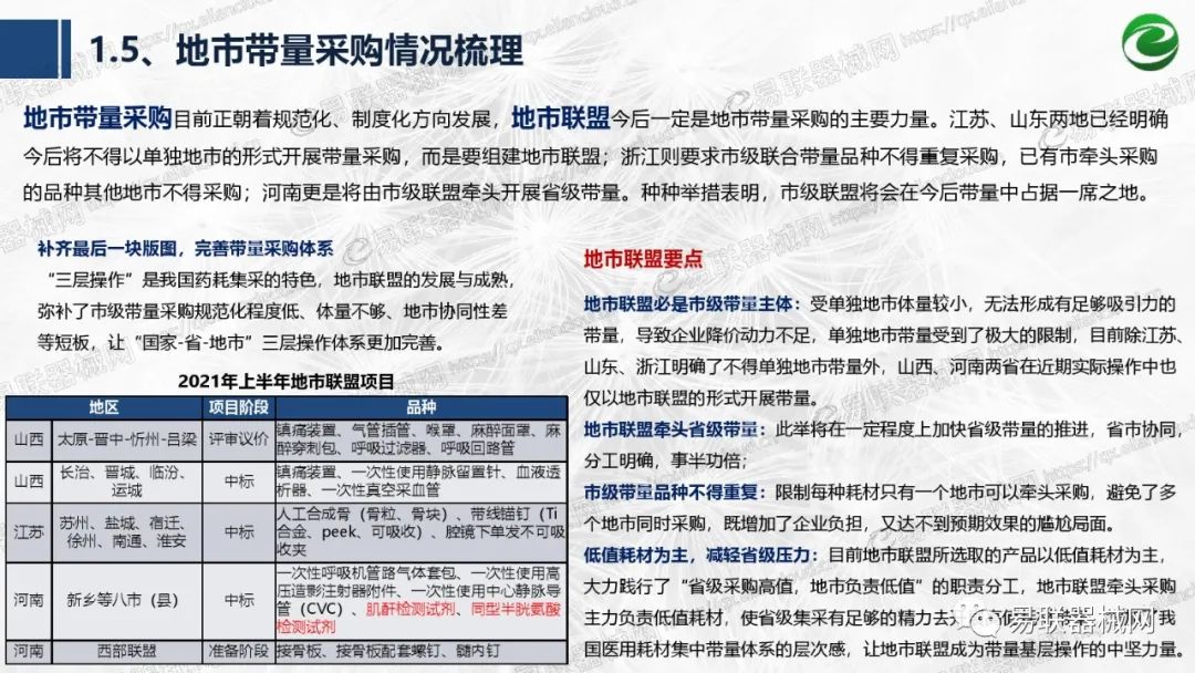 带量采购方面:2021年上半年,带量采购持续发力,仍是行业内的焦点所在。首批带量采购项目即将届满,相应续标工作有序展开;带量采购常态化、规范化文件相继出台,引领耗材带量采购走向新的篇章…… 常规项目方面:各地挂网工作有序开展,新老平台切换稳步推进;地方工作上:北京耗材限价挂网、内蒙古简化挂网流程、四川与江西规范并完善药耗集采工作、河南持续推进阳光挂网、海南实行“红黄绿”价格预警…… 政策方面:八部委联合印发带量采购规范文件,指导高值医用耗材集中带量采购;信用评价制度建立,严厉打击医疗行业不正当利益关系;医疗服务价格改革试点方案发布,建立合理补偿机制,稳定调价预期;医疗器械唯一标识第二批实施工作即将开展;《医疗器械监督管理条例》修订发布,旨在保障医疗器械安全、推动行业健康发展…… |
