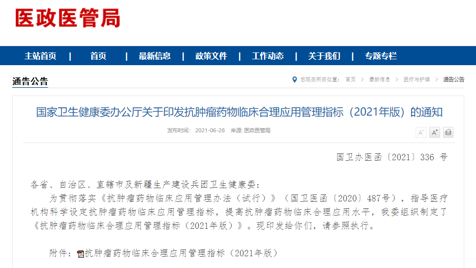 6月28日,为贯彻落实《抗肿瘤药物临床应用管理办法(试行)》(国卫医函〔2020〕487号),指导医疗机构科学设定抗肿瘤药物临床应用管理指标,提高抗肿瘤药物临床合理应用水平,国家卫健委制定并发布了《抗肿瘤药物临床合理应用管理指标(2021年版)》。文件中提出:原则上,经组织或细胞学病理诊断确诊或特殊分子等病理检测成立的恶性肿瘤,才有指征使用抗肿瘤药物和抗肿瘤靶向药物。单纯依据患者的临床症状、体征和影像学结果得出临床诊断的肿瘤患者,没有抗肿瘤药物和抗肿瘤靶向药物的使用指征。