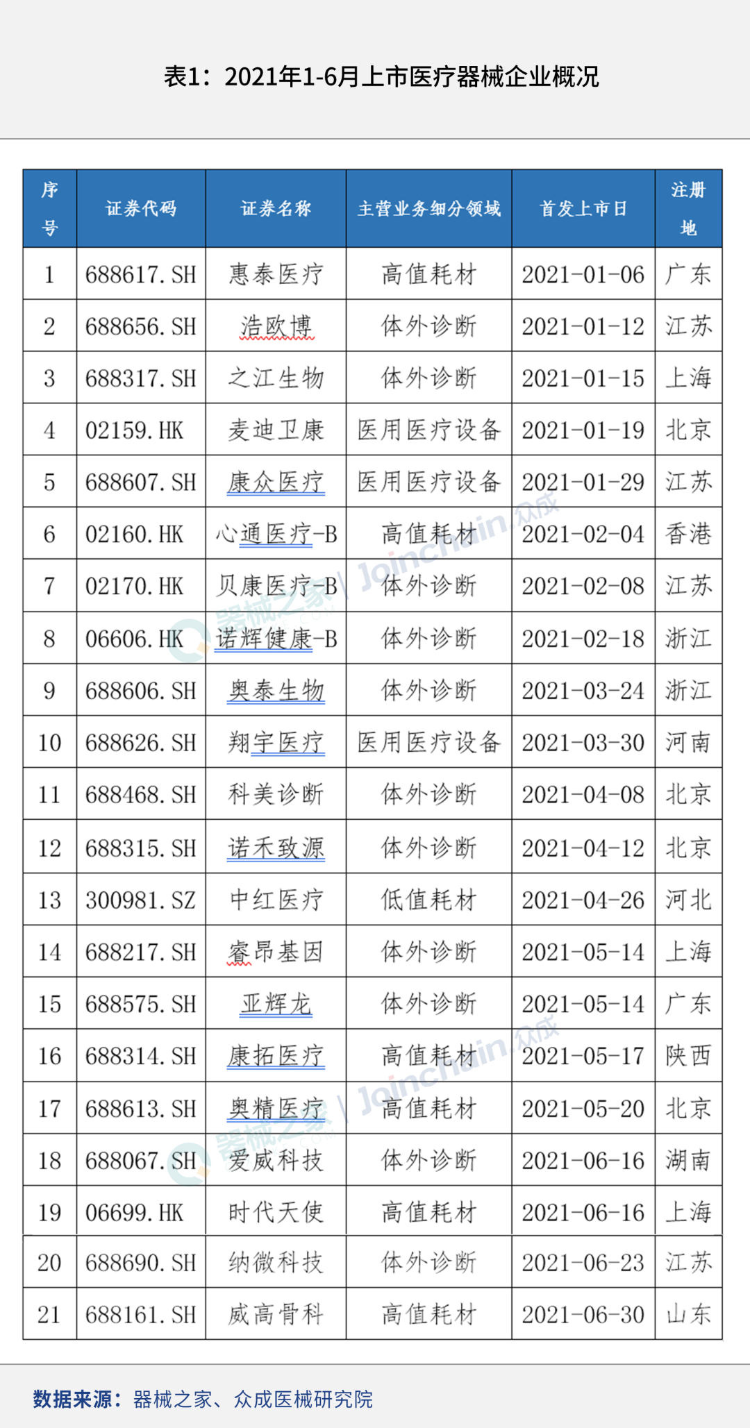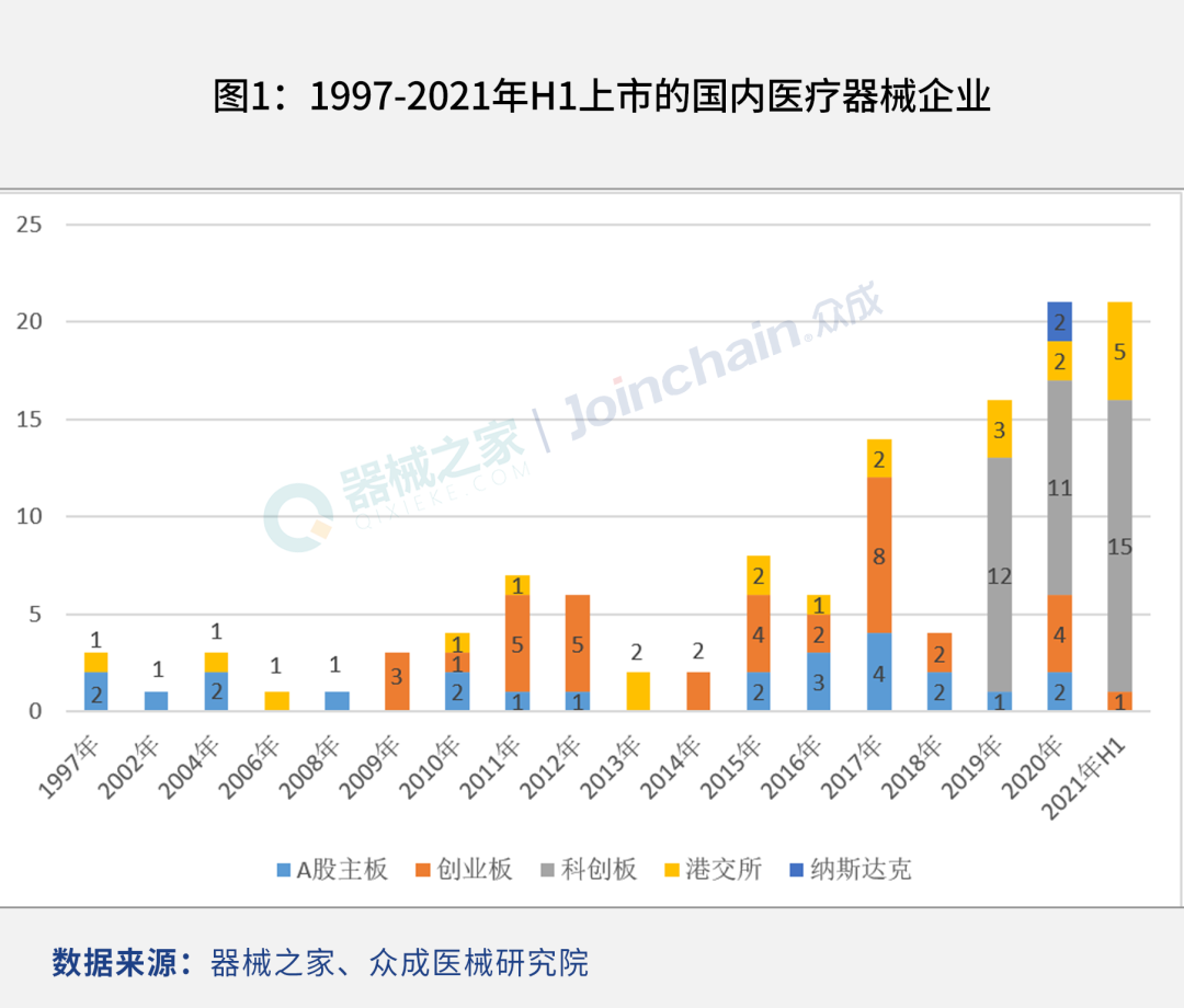 | 联名发布:器械之家/众成医械-医械数据洞察 医疗器械作为注册制改革受益最大的板块之一,也是资本市场长期以来的热衷领域。对此,专业医械信息服务门户「器械之家」联合「众成医械」,以旗下数据创新服务平台“医械数据洞察”为数据支撑,全面盘点了2021年上半年IPO的医疗器械企业,并分析械企IPO的特点。 自科创板、创业板依次推行注册制后,医疗器械企业开启了上市潮,2019年、2020年分别有16家、21家械企上市,较以往平均每年5家企业上市的速度明显加快。 进入2021年,医疗器械企业IPO进程仍在提速,随着国内骨科器械巨头——威高骨科于6月30日登陆科创板,2021年上半年国内医疗器械企业上市数量达到21家,与2020年全年上市械企数持平。 国内械企IPO浪潮持续高涨 从1997年第一家医疗器械上市到2021年6月30日,已有123家医疗器械企业成功上市。我国医疗器械企业上市情况可以分成3个阶段:第一阶段为1997-2008年,以每年1-2家的数量上市;第二阶段为2009-2016年,在创业板上线后,以每年5家左右的数量上市;第三阶段为2017年至今,医疗器械企业上市速度加快,每年械企上市数已升至两位数。 近几年医疗器械企业上市速度加快,尤其是科创板上线后,医疗器械企业纷纷扎堆IPO上市。这背后,市场规模快速增长、资本越来越青睐医械企业、市场竞争激烈迫使相关公司募资、科创板加速行业资本化进程等是近年医疗器械企业上市提速的主要原因。众成医械统计发现,2017年国内有14家医疗器械企业上市,2018年受宏观政策环境原因只有4家上市,2019年后械企上市加速,当年16家上市,2020年有21家械企上市。在此基础上,2021年IPO浪潮依旧高涨,上半年上市械企数已达到21家。 2021年1-6月,共有21家国内医疗器械企业上市,其中科创板15家、港股5家、创业板1家。可以看到,科创板是医疗器械企业上市的首选板块,占今年上半年上市医械企业的71%。 今年1-6月,医疗器械企业每月上市数保持平稳,月均上市数在2-5家范围内,除1月和3月外,其余月份均以每月3-4家的速度上市。 IVD和高值耗材企业占八成 从主营业务上看,2021年1-6月上市的医疗器械企业中,有11家为体外诊断领域,6家为高值耗材领域,3家医用医疗设备领域,1家低值耗材领域。体外诊断与高值耗材的企业上市数占上半年械企上市数的81%。 在细分方向上,上半年IPO的体外诊断企业中,分子诊断领域的企业数最多,达到5家,免疫诊断领域为3家,POCT、体外诊断原材料、体液诊断领域均为1家。 上半年上市的高值耗材企业中,骨科耗材和心血管介入耗材领域分别有2家,口腔高值耗材领域1家,神经外科耗材领域1家。 苏北上三地总上市数占比超50% 从注册地来看,江苏、北京、上海的上市医疗器械企业最多,分别为4家、4家、3家,占今年上半年上市医疗器械企业数量的52%,广东、浙江均为2家,河北、河南、湖南、山东、陕西、香港均为1家。 |