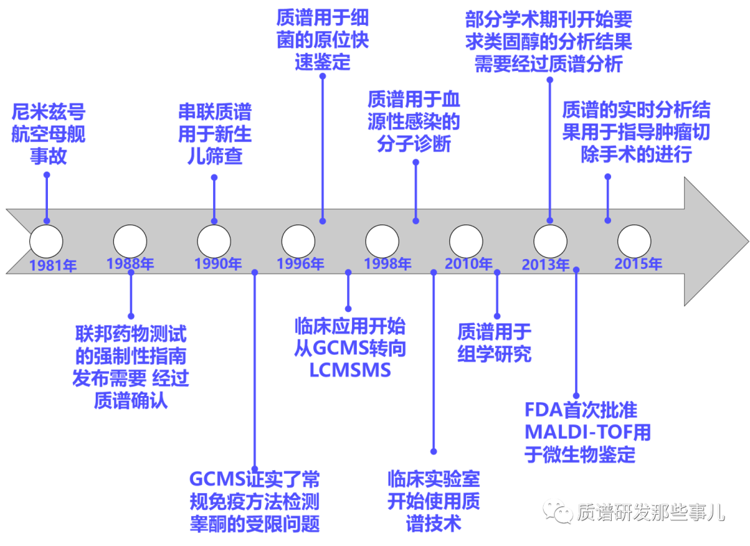 1981年5月26日,美国一架训练归航的EA-6B“徘徊者”电子战飞机在“尼米兹”号核动力航母进行着舰时一头冲向右侧停机区的3架F-14“雄猫”战斗机,随后引发一枚巨大的“不死鸟”导弹爆炸。瞬间,“尼米兹”号的甲板上就发生了大爆炸,火光冲天,飞行员、地勤人员瞬间死亡。最讽刺的是由于美军装备过于先进,在最初的撞击中,有几枚没有当场爆炸,因此现场产生了二次爆炸。事故中共造成14人死亡,45人受伤,11架战斗机严重受损,“尼米兹”号航母也暂时失去了战斗力,不得不回港接受大修。 此次事故造成了极其严重的损失。事后调查指出肇事EA-6B的飞行员违反规定服用抗组织胺药物,以致于降落作业中摇晃不稳,此外由于辅降系统没有完整运作,加上天候气象因素,使得航空管制人员在EA-6B第二次降落时,未能及时察觉偏离航道。而当时夜间辅降系统的大部分灯光都是熄灭的,以致于指引功能大受影响。当时的损管系统也不能发挥完整作用,舰上18个消防泵中只有12个正常工作。更重要的是,事后基于免疫分析对舰上人员进行了尿液检测,发现6名航管人员的大麻代谢物检测结果呈阳性。自此里根总统开始了对军队中滥用药物的零容忍态度。同时,“尼米兹”号航母事故也开启了质谱进入临床应用的大门。大多数药物滥用都是非法的,但由于症状和迹象并不明确,所以在临床标准界限之外的药物滥用很难判断。传统上是用免疫方法进行药物监测,这类方法快速、简便,但可能很昂贵(试剂花费),通常测定的是化合物组,不能测定具体分析物。同时由于缺乏特异性,免疫方法有可能会出现大量的假阳性结果。通常阳性结果必须要用气相色谱质谱GCMS进行确证。1988年,FDA发布了《联邦工作场所药物测试计划的强制性指南》,规定了药物测试结果一定要经过质谱确认。由于质谱的使用,在随后的10年里药物测试结果的阳性率从 18% 下降到 8%。使用GCMS进行确认的强制要求推动了质谱在毒理学实验室的发展,并开始了质谱用于治疗药物的监测。随着GCMS在临床实验室越来越常见,免疫法在类固醇测定中的局限性变得越来越明显,尤其是在测定妇女和儿童低浓度睾酮时明显受限。目前,质谱分析方法已经被确定为激素测定的金标准,它解决了既往方法的低阈值低低灵敏度问题,也可以为睾酮提供试剂盒以及为激素水平的测定提供标准参照。目前,世界上已有3个实验室获得批准进行建立LCMS的标准RMP(Reference Measurement Procedure)测定方法测定睾酮。其中2个在欧洲,使用同位素稀释气象色谱串联质谱法(ID-GC-MSMS),另一个在美国NIST(National Institute of Standards and Technology)实验室,使用基于同位素稀释液相色谱串联质谱法(ID-LC-MSMS)为常规测定方法提供试剂盒、测量参考标准和高水平校准。GC-MS 的主要限制是分析物需要具有挥发性,因此大多数临床分析需要多个提取/纯化步骤以及化学衍生化,以使分析物具有足够的挥发性以进行分析。由于低通量和高成本,GC-MS 分析所需的大量样品制备方案限制了质谱在临床实验室中进一步的广泛应用。不过,大气压电离技术,尤其是电喷雾电离 (Electrospray Ionization, ESI),与高性能的LC-MS/MS的完美结合,让质谱成为常规临床实验室的基础平台已经逐渐变成了现实。ESI LC-MS/MS 消除了对挥发性分析物的要求,因此简化了样品制备流程,继而提高了样品分析通量,并降低了成本。GC-MS 分析的限速步骤是样品制备时间,而 LC-MS/MS 中的限速步骤通常是LC的分析时间。因此,为了进一步提高质谱分析的通量,降低成本,可以将多个LC(2~4个)连接到同一个MS上。这种情况下,最适合用于单一分析物的分析,不同LC的进样是交错的,而MS始终测量同一色谱目标峰。多路复用之所以有效的基本原理是,单次LC的运行时间通常会持续几分钟或更久,然而目标峰通常只在几秒钟的时间内洗脱完毕。如果没有多路复用,大部分时间里MS都在“等待”目标峰的到来和洗脱。通过交错进样,使用4个LC的多路复用系统就可以将MS的生产率提高几倍。2002年,MALDI-TOF质谱技术获得了诺贝尔化学奖,以表彰该技术在解决生物大分子分析难题上的突破性进展。2013年,美国FDA(食品和药物管理局)首次批准了基于MALDI-TOF质谱的微生物快速鉴定产品,从而开启了质谱技术进入临床检验的新时代。今天,MALDI-TOF质谱可以用于微生物的快速鉴定已经不是新鲜事了。在此之前,微生物实验室里通常是依赖革兰氏染色、培养、生化测试和敏感性测试来完成微生物的鉴定。与传统技术相比, MALDI-TOF质谱方法将鉴定的平均时间缩短了 1.45 天。据估计,与标准培养技术相比,实施 MALDI-TOF 将节省 50% 以上的试剂和劳动力成本。梅里埃BioMerieux和 布鲁克Bruker Daltonics 的MALDI-TOF产品是最早一批获得FDA批准用于临床微生物分析的产品。随着微生物鉴定技术的不断发展,人们也逐渐意识到MALDI-TOF或许并不是十全十美的技术,其他技术,诸如16S rRNA基因测序技术、以及其他质谱与PCR的结合技术,也都在一些细分领域里取得了一定的技术优势地位。但这些并不妨碍MALDI-TOF质谱技术在临床应用的地位,同时MALDI-TOF还开拓出了诸如质谱成像(Mass Spectrometry Imaging)等新的临床应用。在病理学研究和实践中,基于MALDI-TOF 的质谱成像技术已被用于识别组织中的蛋白质、肽、药物或代谢物、脂质和其他分析物。具体而言,质谱成像允许对组织切片中的各种分子进行无