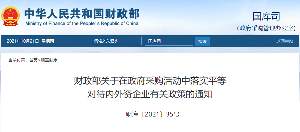 为构建统一开放、竞争有序的政府采购市场体系,促进政府采购公平竞争,现就在政府采购活动中平等对待在中国境内设立的内外资企业有关事项通知如下: