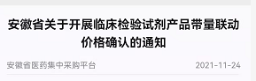 各相关企业: 根据省医保局、省卫健委、省药监局《关于执行安徽省公立医疗机构临床检验试剂集中带量采购谈判议价结果的通知》(皖医保秘〔2021〕100 号,下称《通知》)要求,现对联动产品的带量联动价格进行确认。有关事宜通知如下: 一、联动产品范围 在安徽省医药集中采购平台检验试剂交易系统已挂网(截至2021年9月30日),经公示并经专家论证,属《安徽省公立医疗机构临床检验试剂集中带量采购谈判议价公告》采购产品范围未纳入谈判议价的同类产品。 二、确认时间 2021年11月24日-2021年11月26日12:00。 三、有关要求 (一)按照性能与价格相匹配的原则,并考虑与谈判成功产品合理比价关系,将价格联动到不高于谈判成功产品价格水平。对带量联动价格成功的产品,执行与谈判成功产品相同的配套政策。 (二)请在规定时间内登录安徽省医药集中采购平台医用耗材及检验试剂交易系统(http://jy.ahyycg.cn:8080/UserLogin.aspx)“价格联动管理-联动价格确认”模块,进行联动价格确认操作,点击“同意”并提交,则带量联动成功;点击“不同意”并提交,或逾期未提交,则带量联动不成功。 (三)以注册证为单元开展带量联动价格确认,带量联动价格为注册证下最小单位(每人份或每测试单位等)价格。联动成功后同注册证不同流水号产品按照包装规格换算带量联动价;联动不成功的注册证下所有产品全部视同带量联动不成功。 (四)带量联动价,即为企业的实际供货价,应包括税费、服务、配送等在内的所有费用。相关配套服务内容、质量、标准不得低于带量采购前。 (五)感染性疾病实验检测(乙肝五项)、激素测定(甲功五项),在联动价格确认时,企业须五项产品齐全,否则视为带量联动不成功。 (六)对企业带量联动不成功的产品,原在集中交易目录内的,调整到备案交易目录,进行重点监测,采购周期内不得参与目录动态调整,今后将不再对该企业带量联动不成功的同类产品进行联动,并按《通知》要求严格监管。 (七)带量联动成功结果产生后,若发现带量联动成功产品价格高于我省公立医疗机构采购价的,以采购价最低值作为带量联动价。