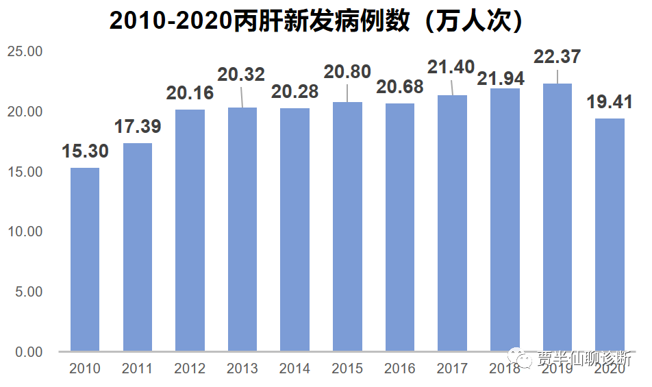 我国CDC统计数据:2010-2020年HCV感染新发人数,近些年年均>21万人次 2020