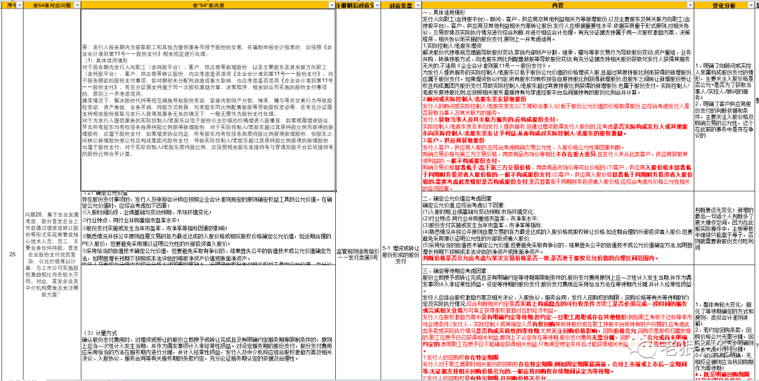 【前言】对投行从业者来说,老“54”条实在太过深入人心,非常有必要以老“54”条为准绳,逐条对比其中的差异,并将简化及删除的内容具体糅合到其他文件的出处也做个详细地阐述。本次修订,也体现了一些目前的审核重点: (1)紧跟注册制强调信息披露、强调针对性和重要性原则的原则,三大板块的规则进行了更新整合,部分较老的监管问答进行了与时俱进的修订; (2)整体的内容较原先进行了精简,部分简单重复或会计准则规定较为明确的简单问答内容进行了删除,如原问答27关于建筑企业工程施工的问题、问答29关于存货减值的问题等;部分已有相关文件规定的内容也进行了删除,如问题36关于主营业务3年内未变更的要求,实质已在《证券期货法律适用意见第3号》中进行了规定; (3)细化了经销业务核查的具体要求,新增的文字篇幅较大; (4)对一些财务处理实务中不够明确的问题进行了细化,比如股份支付的确认、等待期问题等。希望作者此文能对各位看官有所助益,不胜欢喜。 |