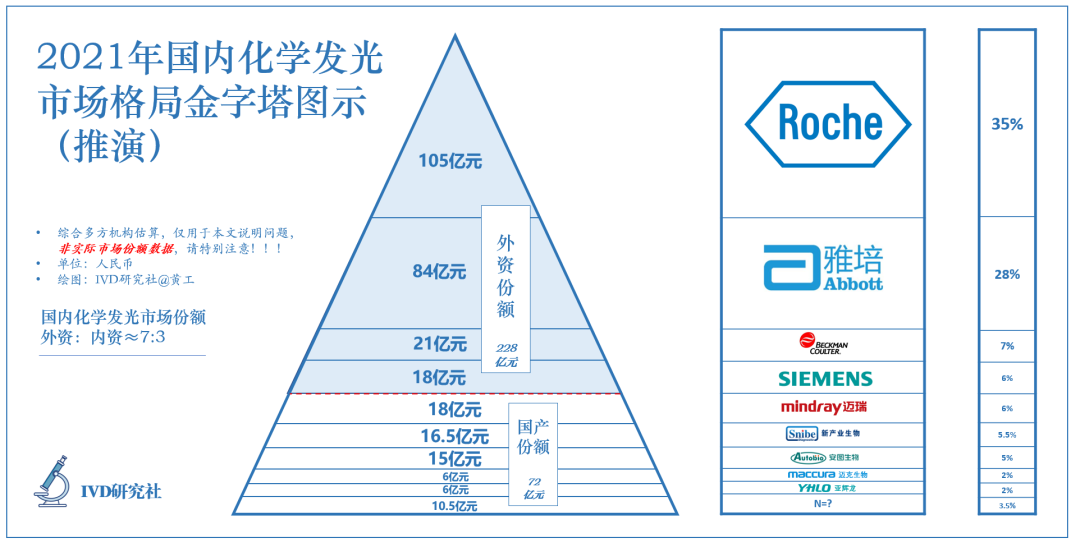 综合多方数据,到2021年底,国内化学发光市场约300亿元,占免疫诊断市场约88%。目前,呈现金字塔式竞争格局: 4+5+N 。N是多少?文末会为大家揭晓。基于此估算推演,国内化学发光格局(1)外资份额:228亿元,其中,①罗氏诊断105亿元,占35%;②雅培84亿元,占28%;③贝克曼21亿元,占7%;④西门子医疗18亿元,占6%; (2)国产份额:72亿元,其中,⑤迈瑞18亿元,占6%;⑥新产业16.5亿元,占5.5%;⑦安图15亿元,占5%;⑧迈克6亿元,占2%;⑨亚辉龙6亿元,占2%;其他10.5亿元,占3.5%。(主要为国产企业,因此归入国产份额,这里有很小一部分外资,暂不计)(国内几家发光龙头,2022年报未披露,故而暂用2021年数据。300和88%,是估算而非实际数据,文章发出后争议声大,呼吁官方发布权威数据!!) 化学发光发展历程