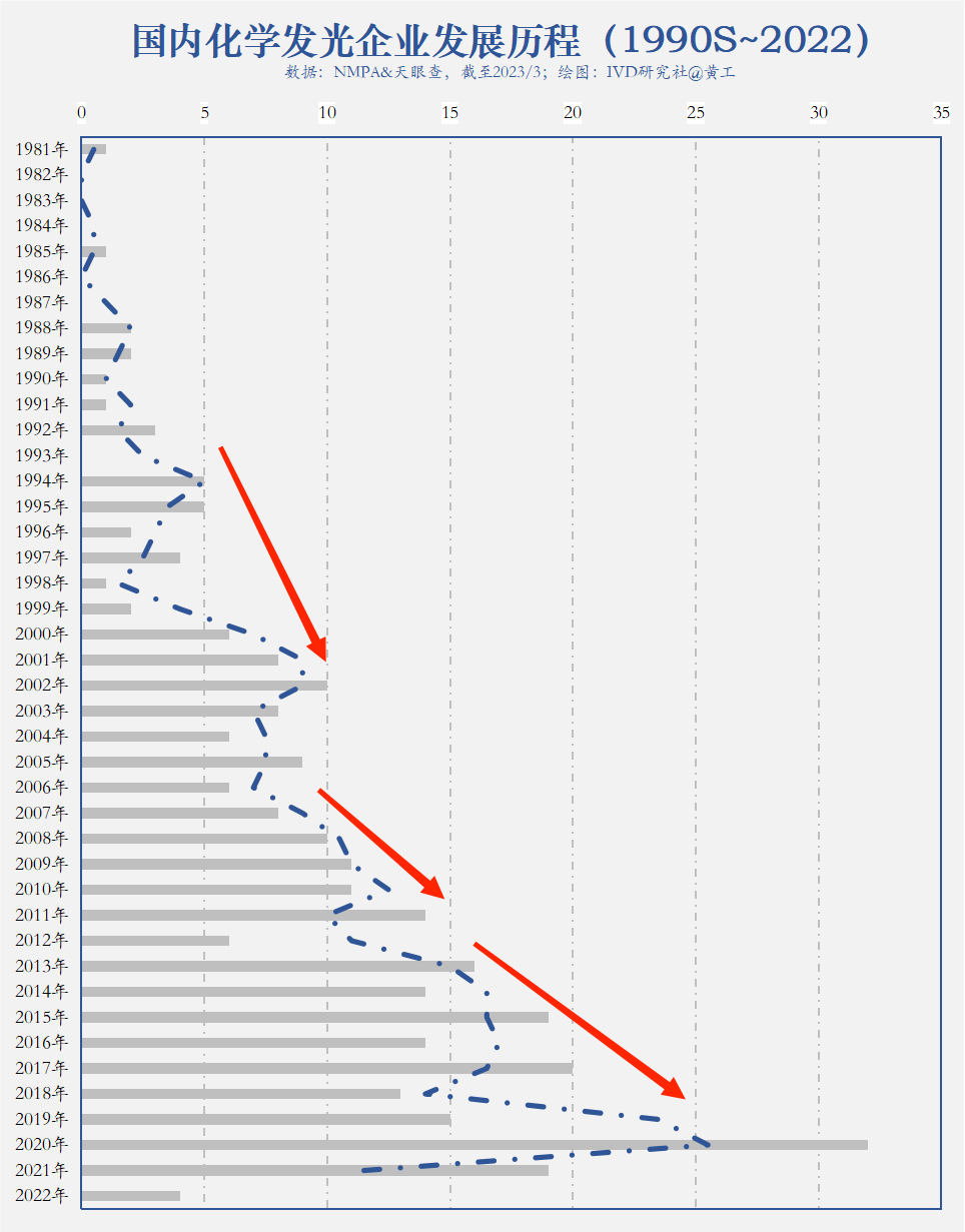 (↑:现存309家有化学发光业务的IVD企业,国产+外资,基于工商注册成立日期绘制上图。当然这些企业,成立之时未必就开始研发化学发光业务,因此本图仅做历史轮廓描述,仅供参考) - 第一阶段:1990S~2003年。这一阶段成立企业共57家,平均每年5家。新产业成立于1995年,国产第一家化学发光企业,一直专注于化学发光免疫分析领域的研究,于2008年9月顺利完成中国第一台全自动化学发光仪的注册,并成功推向市场。