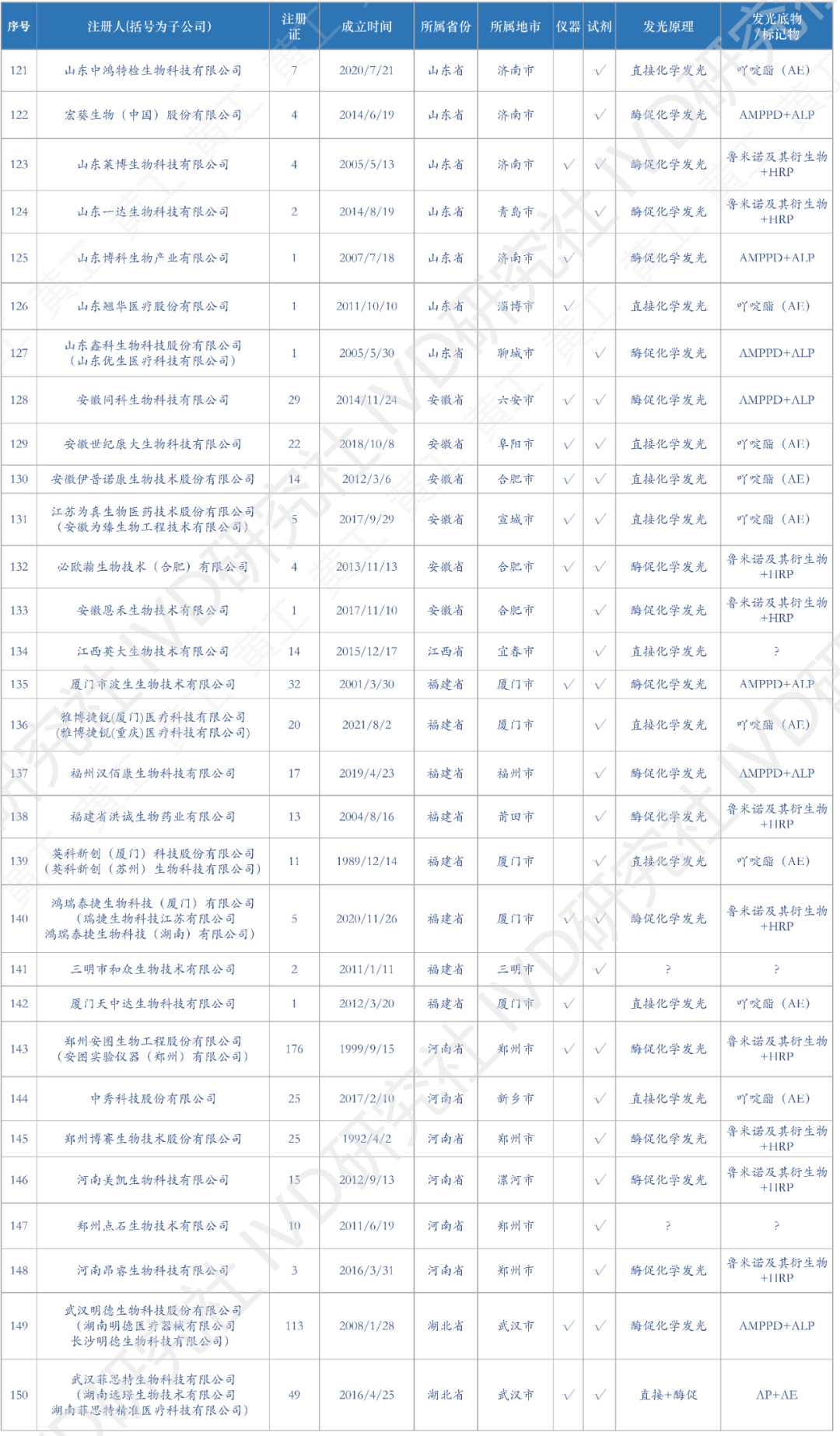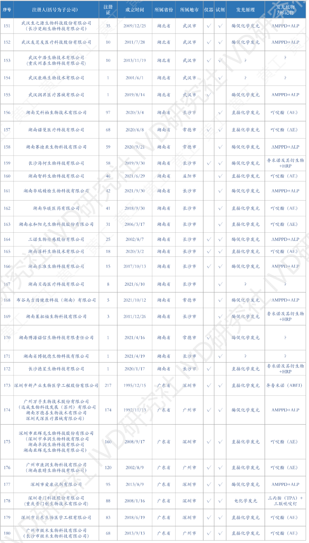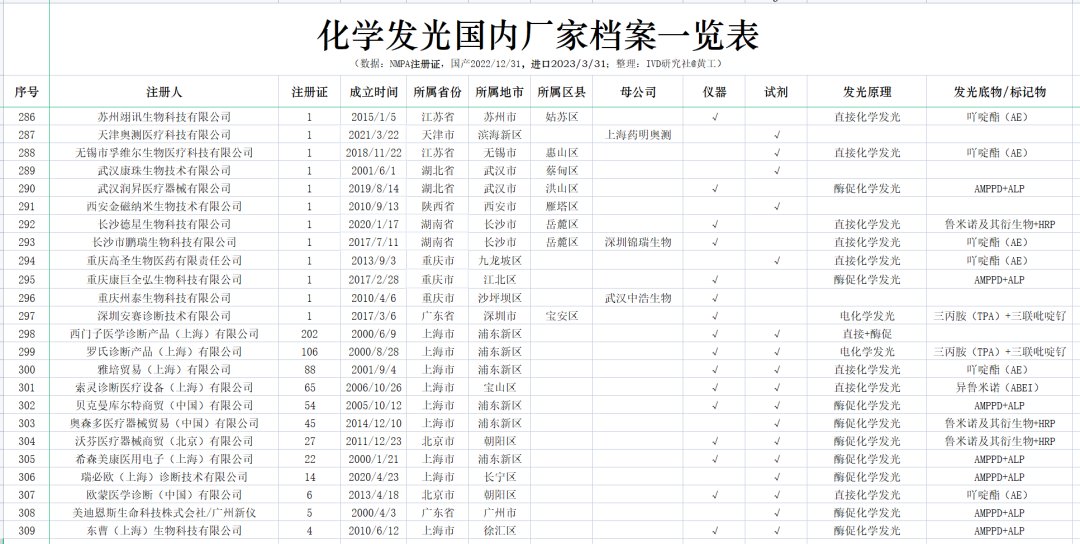 花了一个多月时间,终于把国内化学发光有效注册证数据,全部整理、清洗好了。到2022年12月31日,国产化学发光注册证共6968张;到2023年4月5日,进口化学发光注册证642张。两者加总,目前国内化学发光注册证,大约7600张,包括仪器、试剂、质控品、校准品等。去年统计的国产注册证,到2023Q1可能有增有减,但数据差异不会太大也不影响本文论述。这7600张注册证,登录国家药监局数据库,医疗器械板块,输入“化学发光”整理可得。(↑:目前国内化学发光有效注册证数据,国产+进口,总计7600条)基于上述数据,梳理出国内市场,化学发光相关企业共309家。这309家企业,包括子公司在内,很多不仅从事化学发光业务,也有IVD其他板块的,但都和化学发光有关,就一并整理了。另外,还对这309家企业,成立时间、所属省区市、母公司(控股公司)、业务包含仪器/试剂、发光体系等重要内容,做了进一步的分析整理,基于此表,可一览全国化学发光版图。(需要上表的朋友,可加入文末黄工的知识星球,有很多干货资料供下载,有技术群供交流)