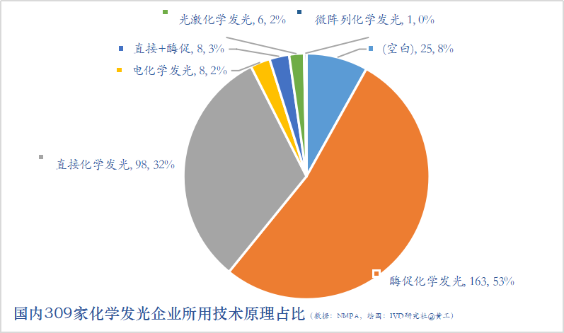 先来看个全貌。国内309家化学发光企业,湖南52家,占17%;广东48家,占16%;北京33家,占11%;江苏32家,占10%;浙江和上海,均为23家,各占7%;山东17家,占5%;天津12家,占4%;重庆11家,占4%;河南和四川,均为8家,各占3%;福建、湖北、安徽3省均为7家,各占2%;广西和河北各5家,分占2%;江西和陕西各3家,占1%;吉林2家,云南、黑龙江、贵州各1家。这些数据,包含国产、进口,也包括子公司在内。湖南化学发光企业数TOP1,主要是其他省市企业,到长沙、湘潭、常德等地注册了子公司。这309家发光企业,都用哪种发光体系呢?超过一半的企业,采用酶促(间接)化学发光法,163家,占53%;有1/3的企业,采用直接化学发光法,98家,占32%;电化学发光8家,仅占2%;光激化学发光6家,仅占2%;直接法、酶促法都兼容的,有8家,占3%,主要是化学发光CMDO/OEM企业;另外还有25家,未准确表述自家产品化学发光体系的,黄工查询药监局数据库、企业官方公众号、专利数据库等,均未获取到发光体系有关信息。对上图进一步分析,目前国内主流发光体系(发光底物+标记物)为:AMPPD+ALP和吖啶酯(AE)。163家采用酶促化学发光的企业,有109家的发光体系为AMPPD+ALP(碱性磷酸酶),占66.87%;98家采用直接化学发光的企业,有92家的发光体系为吖啶酯(AE),占93.88%。 大家都知道,化学发光是封闭系统,有仪器投放医院,是试剂上量、持续盈利的根本支撑。那这309家企业,仪器/试剂业务,各家都是怎样的呢?总的看,309家化学发光企业中,注册有仪器的166家,占53.72%;注册有试剂的254家,占82.2%;同时拥有化学发光仪器和试剂的,则有116家,占37.54%。 那合并子公司,实质运营的化学发光企业主体(母公司),以及国内化学发光版图是怎样的?以下内容,是本文的核心。我们将会看到,目前国内IVD最大市场份额,化学发光赛道都有哪些实力玩家。信息整理,难免有错漏,还望相关厂家朋友,多多包涵,多多指正。