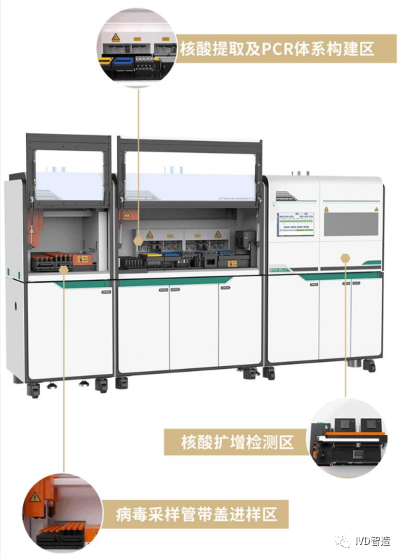罗氏于2014年下半年推出Cobas6800/8800全自动分子诊断分析系统,2018年5月获批(国械注进20183400202),2020年在NCLM会议期间正式在国内发布。 Cobas6800(W292 x H216 x D129 cm) (从左至右,分别是样本导入、样本分杯、提取纯化、扩增检测) Cobas8800(W429 x H216 x D129 cm) (从左至右,分别是样本导入、样本分杯、提取纯化x 2、扩增检测新x 2) cobas 6800/8800基本实现了样本架上机后,从样本识别、分类、分级处理和检测,到最后的报告发送,全流程自动化完成。 检测通量分别达384/8小时、960/8小时,前96个检测结果都在3.5小时内即可出具,此后6800每90分钟检测出96个测试结果,8800每30分钟出96个测试结果; • 内置低温存储系统,可保证试剂的稳定性,确保试剂在开瓶后有效期可达30天; • 冷藏即用试剂,应用时无需复融、混匀、倾倒等准备步骤,交叉污染风险最小化; • 按人份取用试剂,小批量检测减少浪费,充分满足实验室对于试剂存储、使用和管理的需求; BD MAX Clinical全自动核酸提纯及荧光PCR分析系统最早在2014年被批准国内上市(国械注进20143225420),是一个从样本裂解、核酸提取、PCR体系构建、PCR扩增检测都能实现自动化、标准化、用户自定义的集成自动化平台。在不到三个小时的时间内,可以提供多达24个样本的多种检测结果。 BD MAX Clinical包含24个独立的PCR加热元件,每个通道都能运行独立的加热程序。每次运行可处理24个标本,8小时可处理96-120个标本; 其它特点还有 • 单人份组合试剂条,集成提取和扩增DNA/RNA; Anadas 9850 全自动核酸提取及荧光PCR分析系统于 2015 年获得 CFDA和NMPA注册证(国械注准20153220949),是国内最早一批获证的分子诊断一体机。 从原始管取标本、核酸提取纯化、扩增、结果分析全程自动化,最大检测通量96,第一例获得报告的时间小于3小时,之后每轮小于1.5小时,2个人8小时最多可以完成600例样本检测,24小时可以完成2000个样本的检测。6色荧光通道,可以同时检测10个项目; 其它特点还有 • 采用独特的全外排层流通风道系统,相当于Ⅱ级生物安全柜; 说到赛沛GeneXpert infinity全自动医用PCR分析系统,就绕不开GeneXpert,大名鼎鼎的小蓝盒,分子POCT界的王者,样本进结果出的经典分子产品(国械注进20153221448),先来个全家桶; 检测时间按照GeneXpert的参数是单个检测30分钟~2小时出结果,8小时理论检测通量320~1280; GeneXpert Infinity系统本质上是GeneXpert的堆叠(一鱼多吃),通过机械臂代替人工对GeneXpert进行操作,整个前处理、扩增检测都是由GeneXpert来完成,只是GeneXpert Infinity通量更大、自动化程度更高,可以做到试剂盒自动装载上机、自动扫条码及自动卸载试剂盒; 其它特点还有 • 高度模块化,由于GeneXpert Infinity是由多个独立GeneXpert模块组成,所以它最多可以同时进行80个不同的检测项目,同时故障管理;售后维护也很简单方便; • 内置质控和冻干试剂,可以常温储存和运输; • 支持全自动模式和手动模式,人机协同性高; ELITech是一家法国公司,和日本PPS有比较深的合作关系(文末会解释)。ELITe InGenius在2015年获得CE证,目前没有看到在国内获得注册证; ELITe InGenius全自动分子诊断系统集成了提取、扩增和出具结果,具有前所未有的灵活性和丰富的检测菜单。 系统能在并行和独立的通道上处理1~12个样品,单批检测时间约150min; 六色荧光通道,开放式PCR试剂盒,检测参数可编程,菜单扩展性强; 运行模式可以自由设置,仅提取、仅扩增,或者全流程; ps:2020年华北某市疾控中心采购一台ELITe InGenius,价格约146万。 ChiTaSBSS1200全自动核酸检测反应体系构建系统在2017年获批上市(苏械注准20172411510),国内主要应用在血站用于血筛; ChiTaSBSS1200本质上属于核酸检测前处理工作站,由样本汇集区、核酸提取区、缓冲区扩增试剂装配区和随机控制软件组成,单批上样可达384份样本,可实现血清、血浆及其它样本汇集、核酸提取、样本分配及试剂分装,最后转移到实时荧光定量PCR仪上进行扩增。 其它特点还有 • 各功能区的移液器均为专区专用,且试剂、样本的移液器均为专用; • 配置试剂冷藏位,防止实验过程中由于温度升高造成试剂失效; • 采用第二代磁珠转移式磁珠法核酸提取设计,速度快、效果好、污染少; • 加样设备每个通道配有独立的管道、注射器等,方便维修、维护和校准; • 采用封闭空间分区设计、紫外消毒、防漏液系统、缓冲设计、加样尖低位脱排等技术综合防止污染; 其它特点还有 • 支持LDT检测模式,定量和定性可同时上机; • 支持同时处理多种类型和尺寸的原始样本管; • 配有UPS不间断电源; • 样本装载体积最少仅需 1 ml,反应体系低至 19 μl,5 重荧光检测; • NeuDry干式试剂和测试条专利技术,可室温储存,稳定性好,保存时间长; • 提取和扩增过程在密闭的微流控卡盒中进行,更有效防止污染。 AutoSAT 全自动核酸检测分析系统在2019年获批上市(国械注准20193220245),AutoSAT 是高通量全自动 RNA 核酸检测分析系统。 支持原管上机,一次可放置80个样本并实现连续上样,使用等温扩增的方法,90分钟报告第一个样本结果,之后平均2分钟报告一个结果,8小时可检测200样本,24小时可检测500~700个样本; 该系统可以实现核酸提取、扩增、检测、结果分析全程自动化流水线式检测,可搭载 RNA 实时荧光恒温扩增技术平台(SAT)的全系列试剂产品; Panther Fusion全自动核酸检测分析系统(国械注进20193221739)保留了 Panther 平台的