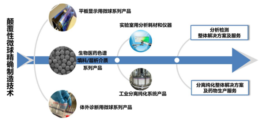 纳微科技开发出世界领先的单分散高效聚合物层析介质的制备技术(种子法),可以对微球材料组成、粒径大小及分布、结构形貌、孔径大小及其分布、表面修饰和功能基团等进行精准调控。纳微科技是目前世界上极少数可以同时大规模生产超纯硅胶、杂化硅胶、聚苯乙烯、聚丙烯酸酯为基质的单分散色谱填料,以及琼脂糖、葡聚糖、纤维素等聚多糖为基质基质的层析介质的公司。产品涵盖了正相、反相、HILIC、手性、体积排阻、离子交换、亲和、疏水、混合模式及定制化的色谱填料和层析介质产品,可以满足有机化药、手性药物、天然药物、抗生素、胰岛素多肽、大分子生物药、蛋白、抗体、核甘酸、疫苗、病毒等分离纯化的广泛需求。