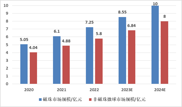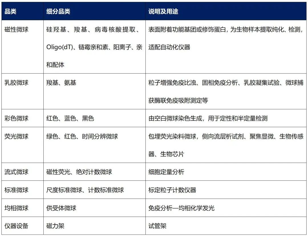 根据菲鹏生物招股说明书,从IVD原料分类及占比情况来看,抗原抗体、酶和底物分别占45%和30%,其余原材料中,磁珠占比5%、微球占比4%,膜占比3%,引物和探针占比3%,剩余耗材占比10%。根据Frost&Sullivan的统计数据计算,2022年IVD领域微球市场规模为13亿元。