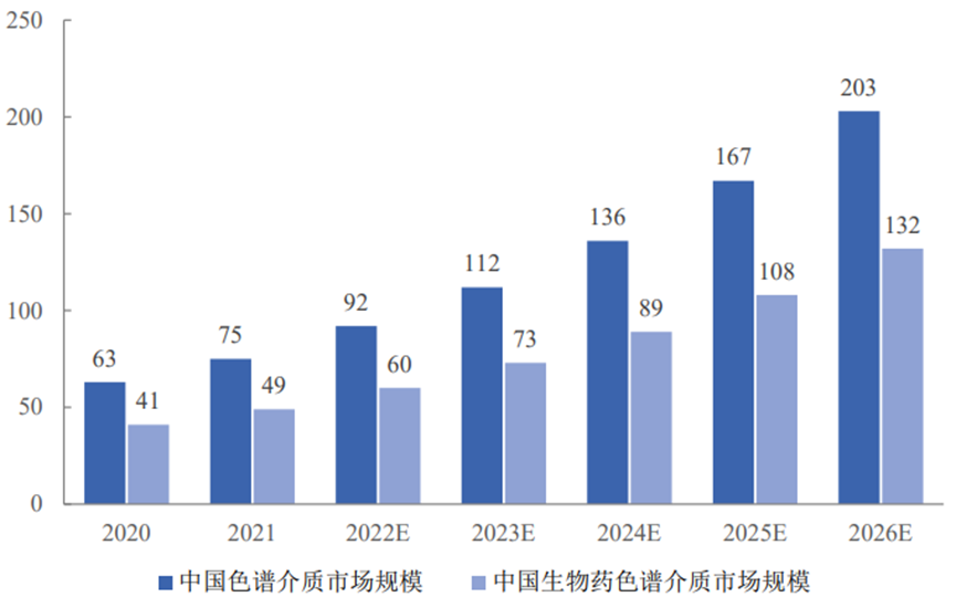 图 2020-2026年全球色谱介质和生物药色谱介质市场规模(亿美元)3 相比国外,受限于微球的产业化技术门槛,我国色谱介质行业发展较晚。但随着近年来我国从政策层面及科技研发支持方面加大对生物医药的重视及投入,下游市场需求不断释放,我国色谱介质呈现高速增长趋势。根据前瞻产业研究院数据,2021年中国色谱介质市场规模为75亿元,其中生物药色谱介质市场规模为49亿元。预计我国色谱介质市场将于2026年达到203亿元,2021-2026年期间年均复合增长率为22%。