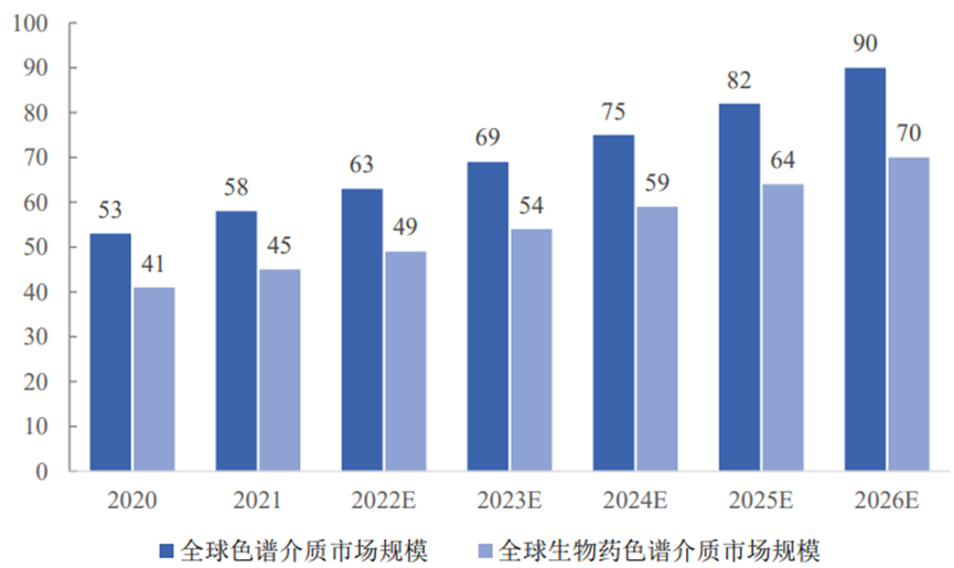 图 生物药生产流程图2 以抗体药物为例,其生产过程较为复杂,包括上游的发酵及下游的分离纯化,下游工艺主要包括膜过滤及多步层析分离纯化。标准的抗体层析分离步骤包括三步:第一步采用ProteinA层析进行抗体捕获和浓缩;第二步采用离子交换进行中间纯化以去除多聚体,宿主蛋白等杂质;第三步采用离子交换或疏水层析去除剩余微量杂质。层析是抗体下游工艺的核心环节,也是抗体生产的主要成本和瓶颈所在。除此以外,在疫苗制备过程中,分离纯化技术可用于提高疫苗效力、减少副反应。胰岛素生产过程中,层析纯化体系主要是用于除去胰岛素原和类胰岛素原杂质。mRNA药物下游制备过程中需要采用分离层析方法去除用于合成的原材料以及mRNA杂质,例如中止的短转录、双链RNA和聚集体等,相比传统的沉淀法,层析法可以获得更高的回收了和纯度,更好的可预测性、可扩展性和更好的重现性。重组蛋白的制备过程中,层析技术用于将目标蛋白与其他副产物及各种性质的蛋白、核酸、多糖等分离出来,同时保留目标蛋白的生物学活性和化学完整性。根据前瞻产业研究院数据统计,2021年全球生物药色谱介质市场规模为45亿美元,预计于2026年达到70亿美元,2021-2026年期间年均复合增长率为9%。