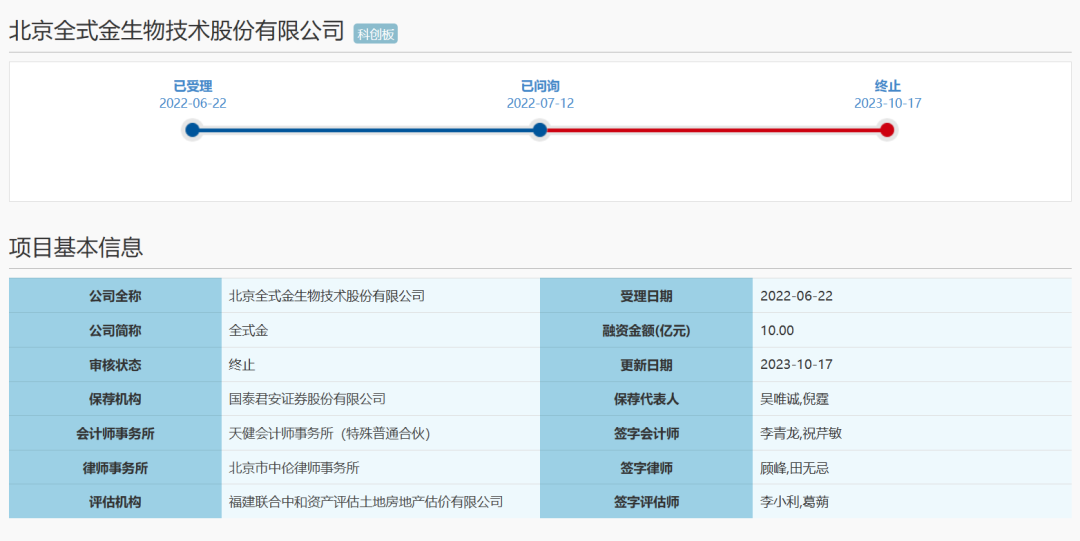 随着新冠的影响渐行渐远,IPO更多重新冠检测业务的公司关上了大门。 2023年10月17日,上海证券交易所官网显示,北京全式金生物技术股份有限公司科创板上市申请终止。