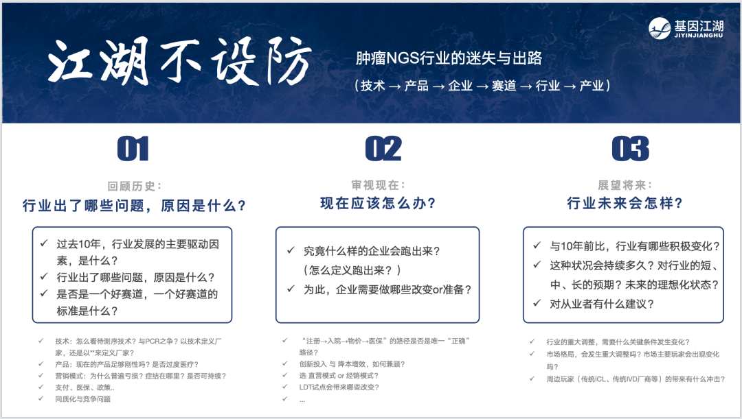 “不像一个纯粹的科学家,而对技术、产品、市场等,有很多突破常规的认识。”在公众号版主“陈在不在”的引荐和共同参与下,我们和思路迪熊磊博士进行了两个半小时的交流。我们问了很多,熊博讲了很多。讨论前,我给了一个题目 “肿瘤NGS十年迷失与出路”。临床NGS发展到今天,如大家所见,一定是出现了些问题。“问题在哪?如何解决?未来会怎样?”这是我想问的三大方向。这次非正式访谈,并不带有任何商业诉求,更不是马后炮式的分析来证明自己有多么高明。更多的只是一位行业老兵对于自己躬身入局的创业十余年、对于行业发展至今的体察、思考、洞见。访谈原始纪要5万字,摘录其中3000字。希望对大家理解这纷繁复杂、悲观与乐观交织的现在,有些许帮助。留言区支持任何建设性讨论。(下文多为受访者的即时记录,力求真实,即时表达不必求全责备。少部分内容做了不曲解原意的修改。)今天我们谈了很多融资环境、谈医疗反腐等政策对肿瘤NGS市场的冲击,行业悲观,从业者困惑。但不管外面的环境看上去有多么恶劣,我只看两个本质的东西:我觉得只要这两个问题的回答是yes,其他的环境的东西,那就是企业经营期间自然要面临的问题,都是可以解决的;但如果是这两个(本质的)东西出现了问题,你所说的临床需求并不存在,或你的技术(或产品)根本就不能解决你所提的需求,这才是行业最大的风险。除了这两点,我不认为其他东西是风险,其他东西在发展过程中,它总是曲折变化的,很正常。没有什么行业是一帆风顺的,我们但凡看到行业一帆风顺的,可能有两个原因,一、它下行期还没有到;二、我们对这个行业的发展历史了解比较少,它或许早已经历过下行的阶段。每一次行业环境的变化,都是企业发展的机会所在,变化越剧烈,企业面临的机会就越大。当然,从另外一个角度来说,挑战也就越大。“没有这4个要素的成熟,
