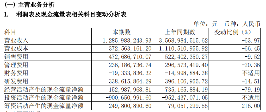 报告期内公司发生主营业务成本37,164.58 万元,较上年同期下降 66.47%,主要系销售规模下降成本相应减少导至;