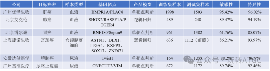 下面依次进行解读: 广州优泽生物-肝癌试剂盒 检测样本类型: 血液 检测靶点: BMPR1A/PLAC8 产品模型: 此产品是基于数字PCR平台,可以直接得到目标靶点的甲基化比例,阈值设置:BMPR1A基因≥5.5%或当4.0%≤BMPR1A基因<5.5%,PLAC基因≥10%为阳性;BMPR1A基因<4%或当4.0%≤BMPR1A 基因<5.5%,PLAC 基因<10%为阴性。 产品适用: 本产品适用于临床上对疑似原发性肝细胞癌、混合型癌的辅助诊断,包括临床肝区影像学检查和既有临床检查怀疑肝区占位性病变的患者,检测结果阳性不作为肝癌临床确诊的唯一依据,检测结果阴性也不能排除肝癌的可能。该检测不能作为肝癌早期诊断或确诊的依据,不宜用于普通人群的肿瘤筛查。训练集样本: 入组(包含建立和验证)样本数共计 1998例,包括肝细胞癌、肝细胞癌-肝内胆管癌(混合型癌)、良性肝脏疾病、其他肿瘤样本等。测试集样本: 纳入临床病例 1503 例,其中,非侵入性方法无法进行明确诊断的肝脏疾病病例 96 例,其 中肝癌病例 542 例,非肝癌的其他病例 979 例(包括其他易产生干扰的肿瘤及各种良性疾病病例)。性能表现: 北京艾克伦-肺癌试剂盒 检测样本类型: 血液 检测靶点: SHOX2/RASSF1A/PTGER4 产品模型: 逻辑回归 产品适用: 本产品用于临床上对疑似肺癌患者的辅助诊断,检测结果阳性不作为肺癌早期诊断或确诊的证据,检测结果阴性也不能排除肺癌的可能。 该检测不能作为肿瘤早期诊断或确诊的依据, 不宜用于普通人群的肿瘤筛查。 训练集样本: 有效样本数共计489 例,包括肺部正常样本 207 例、肺癌病人样本 141 例、其它干扰样本(包括结节、肺炎、肺结核、囊肿、食管癌、胃癌等)141 例。测试集样本: 有效例数 248 例,包括肺部正常人样本 81例,肺癌病人样本 76 例,其他干扰样本 91 例。性能表现: 特异性为 94.19%,灵敏度为 89.47%,总符合率为 92.74%。 北京博尔诚-胃癌试剂盒 检测样本类型: 血液 检测靶点: RNF180/Septin9 产品模型: 单靶点判别模型,当RNF180基因、Septin9基因分别有一个为检测阳性或两个均为检测阳性时,可判定为检测阳性。 产品适用: 该产品适用于经临床医师诊断建议胃镜检查同时由于患者个人原因拒绝进行胃镜检查的患者。检测结果阳性不作为胃癌早期诊断或确诊的证据,检测结果阴性也不能排除胃癌的可能,患者最终诊断应依据胃镜检查结果。该产品不用于普通人群的肿瘤筛查。基于现有研究,仅限于有胃癌家族史者或40 岁以上胃癌高风险人群检测。 训练集样本: 对 961 例临床样本进行检测,其中包括其中胃癌样本 393 例( I 期 66 例、II 期 68 例、III 期 173 例、IV 期 33 例、分期不明 53 例),浅表性胃炎样本 184 例,萎缩性胃炎样本 170 例,其他胃部疾病样本 39 例,其他癌症样本 175 例(大肠癌、食管癌、胰腺癌等)。 测试集样本: 共筛选有效病例 1382 例。其中胃癌病例 680 例,非胃癌病例 702 例。胃癌病例涵盖了胃癌不同分期的患者,占总入组病例数的 49.20%( 680/1382)。非胃癌病例包括交叉反应人群样本共 702 例,其中含对照组共 536例( 包括:浅表性胃炎、萎缩性胃炎、胃息肉、 肠化生、 低级别内瘤变、 其它胃良性疾病及其它疾病(胃溃疡、糜烂性胃炎等) 和良性肿瘤), 166 例其它癌症样本( 包括主要高发癌症:肺癌、肝癌、乳腺癌、食管癌和肠癌;还有发病率较低的癌症:胰腺癌和卵巢癌)。 检测灵敏性为 61.76%( 420/680),特异性为 85.07%( 456/536)。试剂盒检出 I 期灵敏性为 50.00%,Ⅱ 期的灵敏性为 62.32%, Ⅲ期的灵敏性为 67.68%, Ⅳ期的灵敏性为 82.00%,分期不明灵敏性为 55.88%。上海捷诺生物-宫颈癌试剂盒 检测样本类型: 宫颈脱落细胞 检测靶点: ASTN1、 DLX1、ITGA4、 RXFP3、 SOX17、 ZNF671 产品模型: 采用逻辑回归分析方法确定模型中 6 个基因的权重, 建立 6 个基因的评分, 然后根据约登指数最大的原则确定最佳阈值。产品适用: 本产品适用于 12 种高危 HPV( hrHPV)基因型( 31、 33、 35、39、 45、 51、 52、 56、 58、 59、 66、 68 型)检测阳性的 30 岁以上女性人群,帮助识别是否需要进行阴道镜检查,达到分流管理的目的。使用本产品检测,当检测结果为阴性时,提示无宫颈病变或宫颈病变级别较低的可能性较大,可避免阴道镜及组织活检检查,做好定期复查;检测结果为阳性时,提示宫颈病变级别较高的可能性大,需进一步进行阴道镜和/或组织活检检查。 训练集样本: 636 例样本中≤ CIN1(轻度不典型增生) 病例 503 例, CIN2 (中度不典型增生)病例 85 例,≥ CIN3 (重度不典型增生和原位癌)病例48 例。 测试集样本: 临床试验前瞻性入组 12 种 hrHPV 检测阳性病例 1112 例, 30 岁以上适用人群受试者 746 例, 其中阴道镜和/或组织病理学检查为阴性的病例473 例, CIN1 病例 157 例, CIN2 病例 73 例,≥ CIN3 病例 43 例。 性能表现: 针对 30 岁以上 12 种 hrHPV 检测阳性的人群: 以 CIN2 为临床诊断界值, 试验体外诊断试剂临床灵敏度为 86.21%,特异度为 93.97%,阳性预测值为 72.46%,阴性预测值为 97.37%。以 CIN3 为临床诊断界值, 试验体外诊断试剂临床灵敏度为95.35%,特异度为 86.20%,阳性预测值为 29.71%,阴性预测值为 99.67%。试验结果显示,试验体外诊断试剂用于 12 种 hrHPV 检测阳性患者分流时,与宫颈细胞学检查相比,在灵敏度基本一致的情况下,特异度显著提高( P< 0.0001),可有效降低不必要的阴道镜转诊数量。 安徽达健医学-膀胱癌试剂盒 检测样本类型: 尿液 检测靶点: Twist1 产品模型: 单靶点诊断模型,