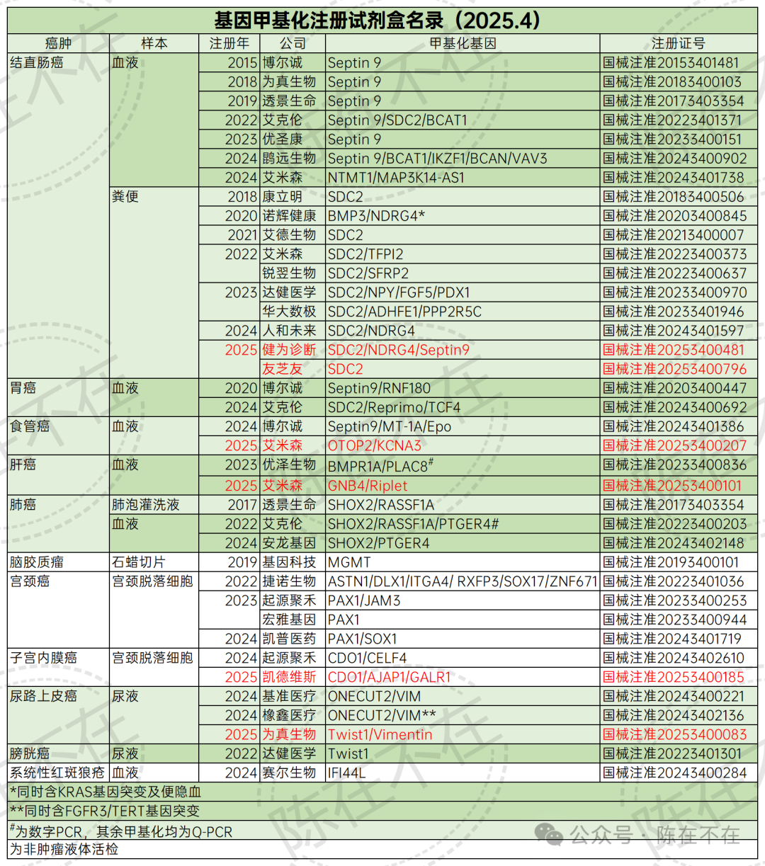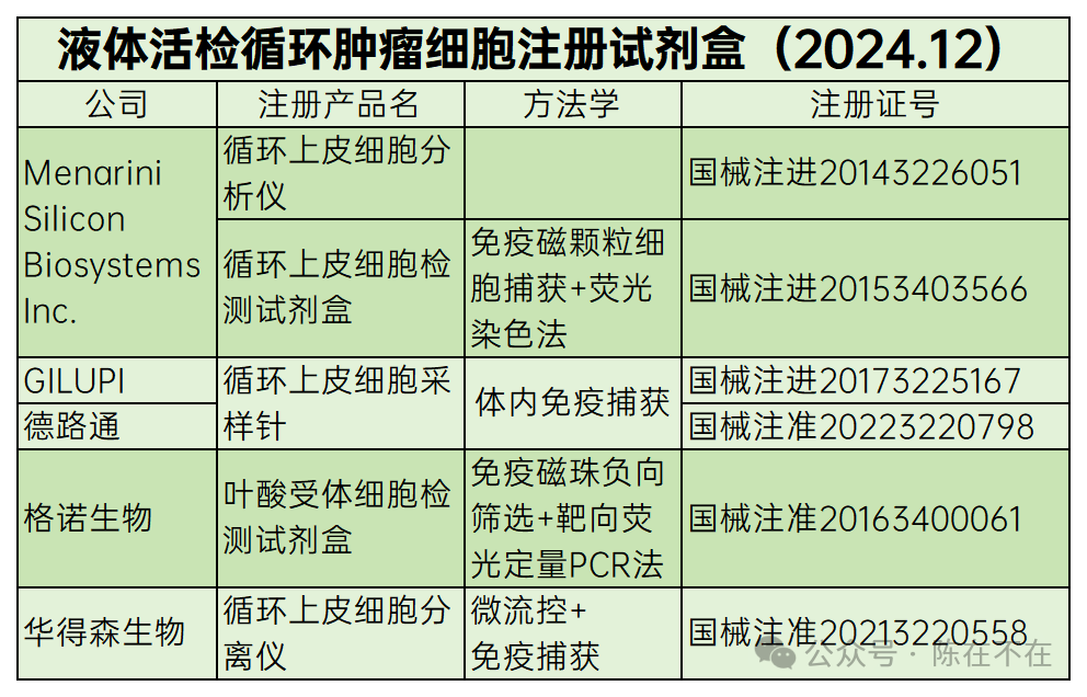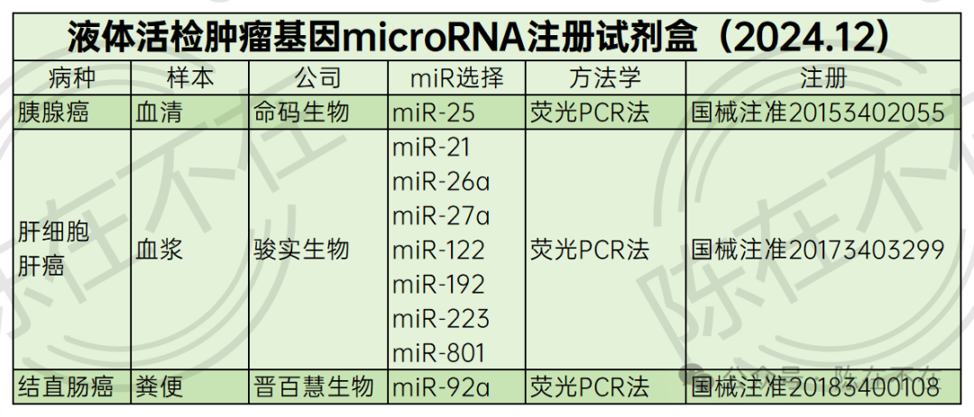 主要是EGFR基因突变试剂盒。 还有两个是与基因甲基化联合检测。 艾德生物拥有第一个肿瘤荧光PCR液体活检注册试剂盒,其2019年获得的二代测序BRCA1/2试剂盒被认为实际检测的是白细胞胚系突变。新羿制造则获得数字PCR肿瘤突变液体活检首证。第一个肿瘤NGS液体活检注册试剂盒花归优讯医疗。 肿瘤基因甲基化 截止到2025年4月,基因甲基化获证38个,其中:37个与肿瘤相关;1个为系统性红斑狼疮。肿瘤基因甲基化试剂盒中:1个样本为石蜡切片,6个为宫颈脱落细胞,其余30个液体活检试剂盒见下表绿色部分。 microRNA microRNA(miRNA)是一类内生的、长度约 20 - 24 个核苷酸的非编码单链 RNA 分子。 截止到2024年12月,microRNA获证试剂盒3个,均为PCR法,见下表。 循环肿瘤细胞 循环肿瘤细胞(CTCs)是一群被认为从原发性肿瘤或转移性肿瘤部位脱离,并在血液中循环的肿瘤细胞。由于它们是完整的活细胞,在循环系统中具有较长的半衰期,并且提供了一些无法通过 ctDNA 分析获得的参数,包括 RNA 和蛋白质分析以及完整的基因组。 捕获 CTCs 进行分析存在重大挑战。CTCs 是罕见事件,即使在转移性癌症患者中,也并不总是存在于外周血中。即使存在,其浓度也非常低,处于每十亿个红细胞和数百万个白细胞中只有一个 CTC 的范围。CTC 标志物可能与原发性肿瘤细胞的标志物不同,并且在治疗过程中也可能发生变化,这使得它们难以靶向定位。 根据《2023年第三次医疗器械产品分类界定结果汇总》,以下建议按第三类医疗器械管理: (四十七)血液循环肿瘤细胞自动分选仪:由精密加样系统(由传输系统、清洗系统、温育系统、混匀系统、软件系统组成)和分选系统(由磁珠吸附模块、样品和磁珠混匀模块、离心模块、照明和UV消毒模块组成)组成。与荧光原位杂交样品处理试剂盒配合使用,用于循环肿瘤细胞的富集,经提取后的细胞用于后续染色计数或其它靶标物质检测。分类编码:22-10。 外囊泡 目前,肿瘤外泌体获证试剂盒仅思路迪一家。通过体外测定人血清外泌体中的CA125、HE4和C5a浓度,并经给定的计算公式计算卵巢癌评分OCS(ovarian cancer score) ,适用于临床上发现有附件包块的女性患者,辅助诊断上皮性卵巢癌。 以上为肿瘤液体活检NMPA注册产品。NIPT及生殖健康,器官移植等方面的液体活检产品未在此列。 液体活检作为一种新兴的肿瘤检测技术,具有无创、可重复等优点,但在临床应用和推广过程中仍面临着诸多挑战:
